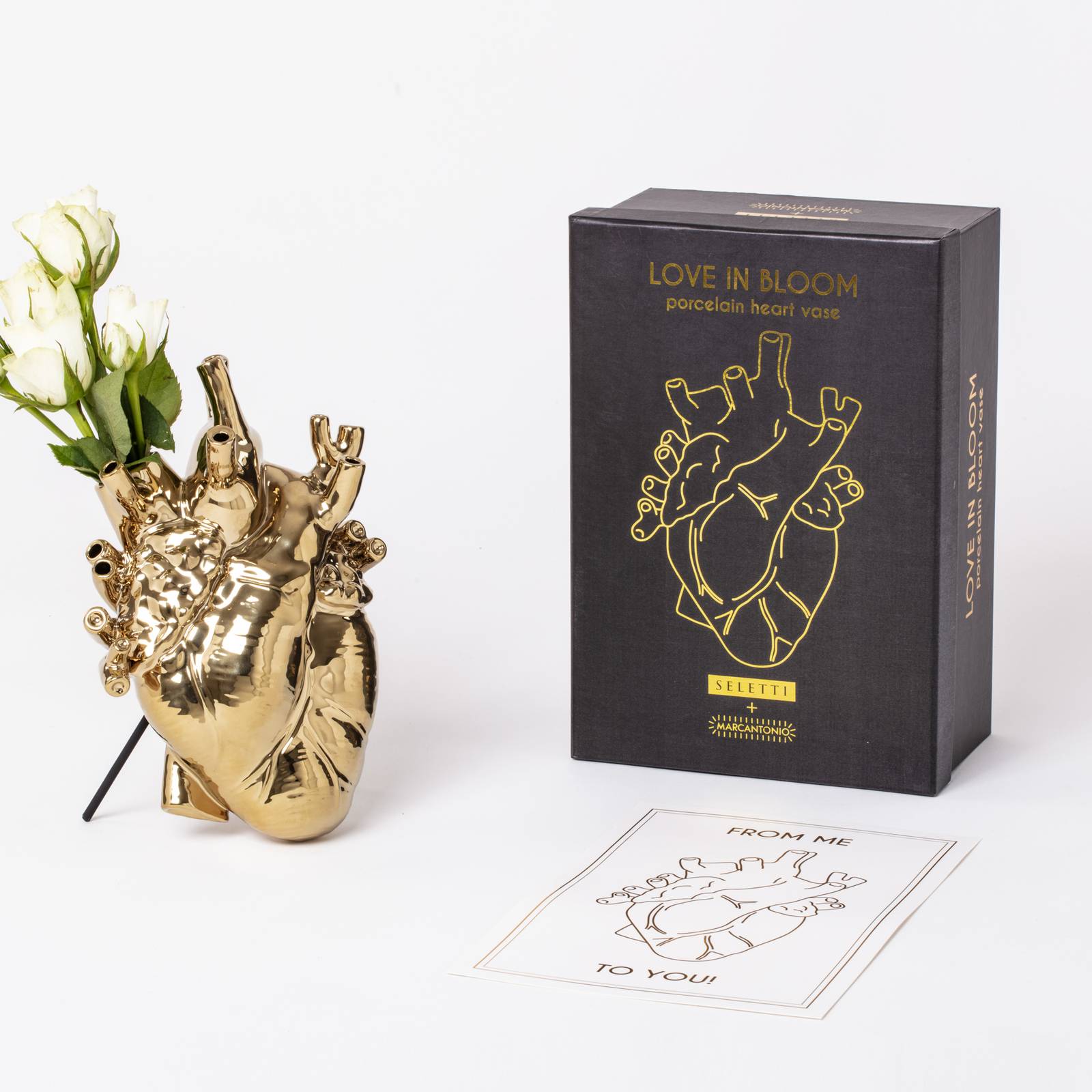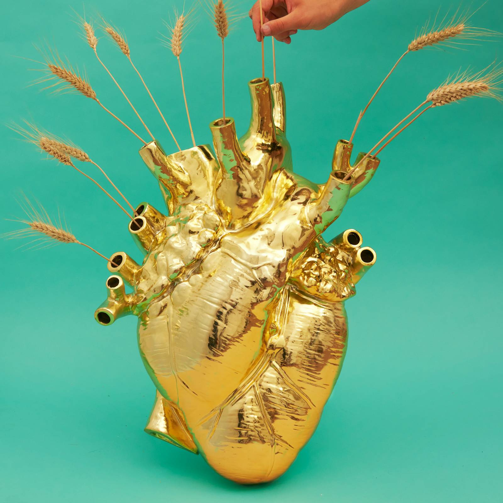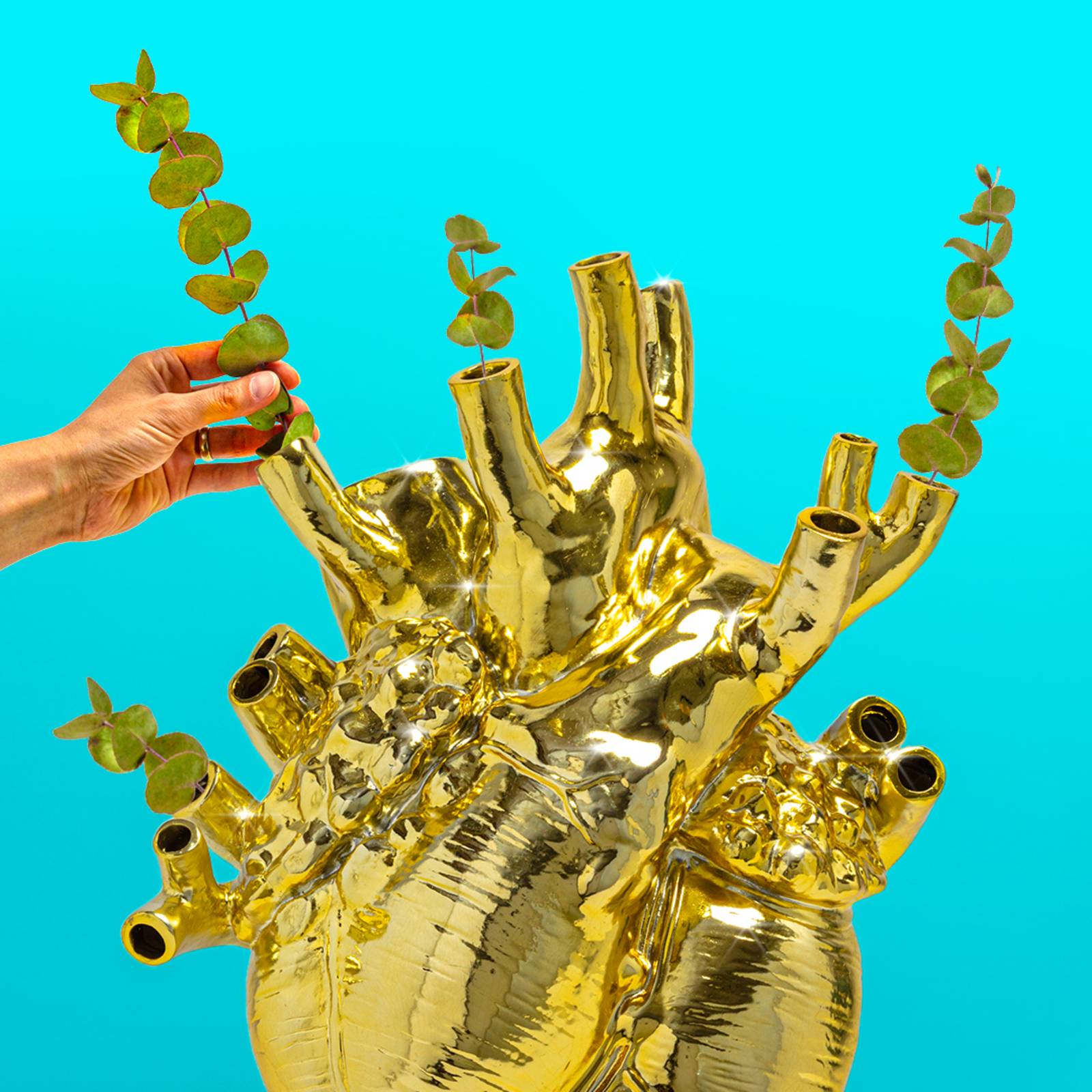 Plantenpot en sculptuur in één: goudkleurige Love in Bloom vaas van hoogwaardig porselein van SELETTI Love in Bloom is een hartvormige vaas die eruitziet alsof hij uit een essay over menselijke anatomie komt. Een moderne liefde vertaald in een romantisch maar onvoorspelbaar cadeau. Het is geen droom, het is liefde in bloei. Het is geen lente, het is liefde in bloei. Inclusief standaard en geschenkdoos.