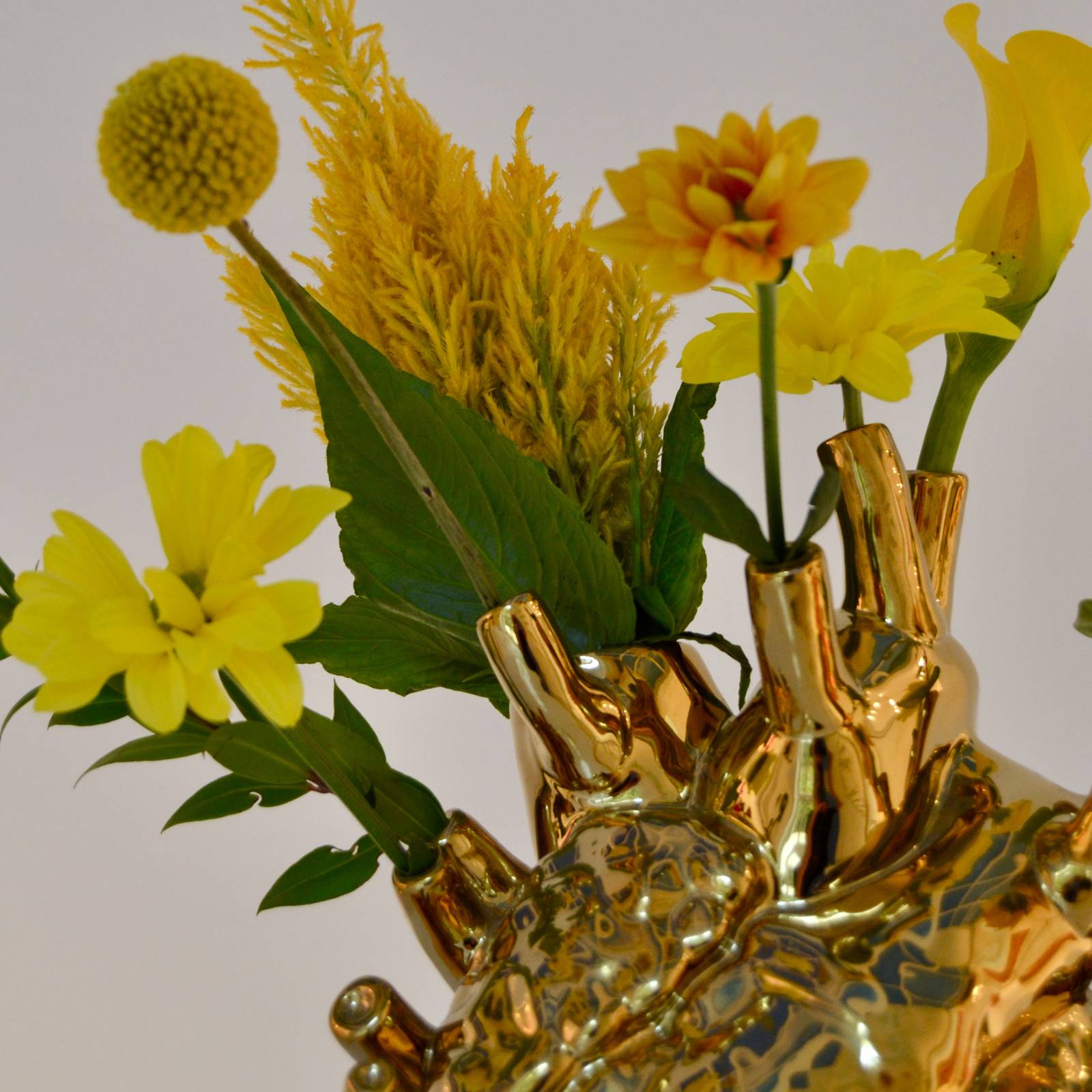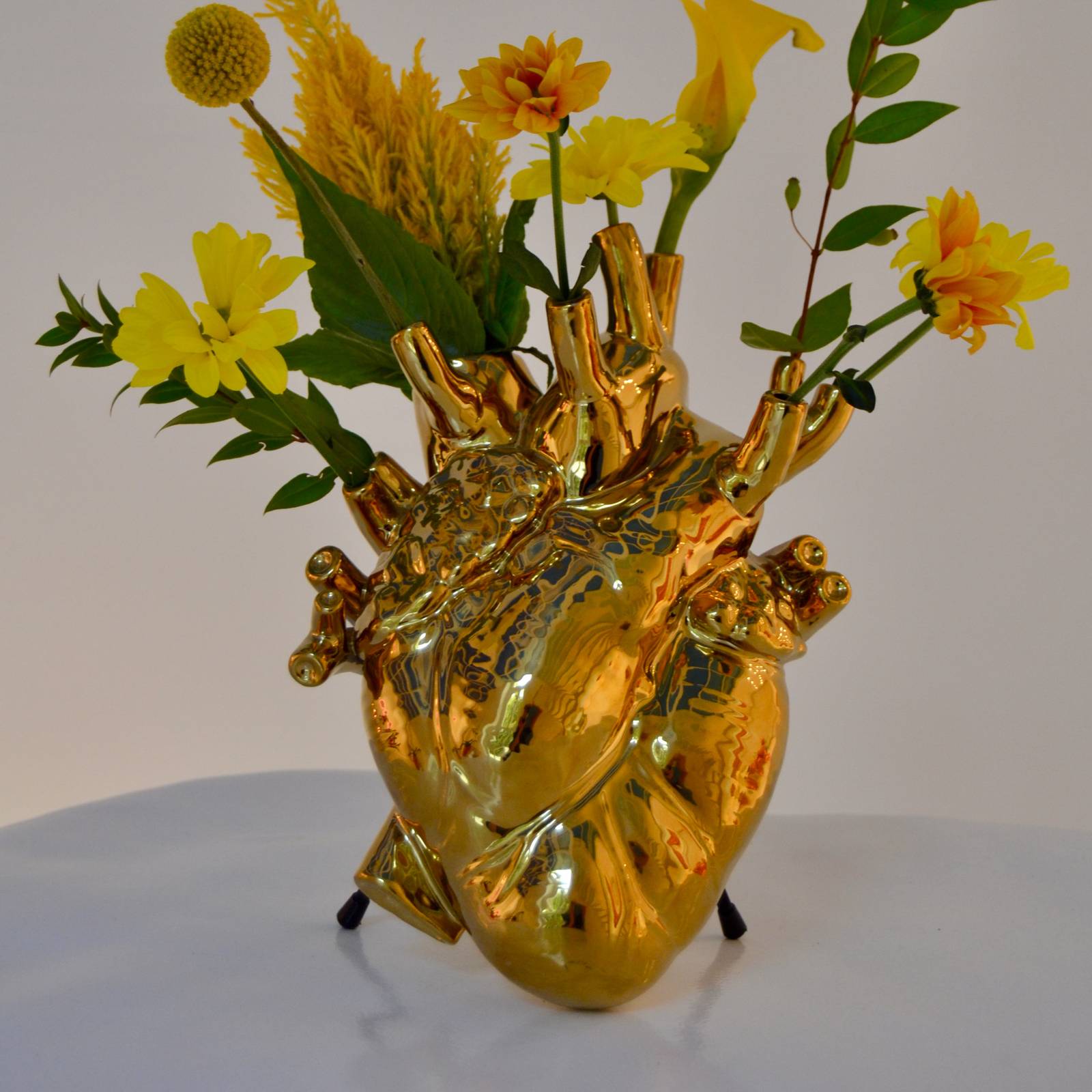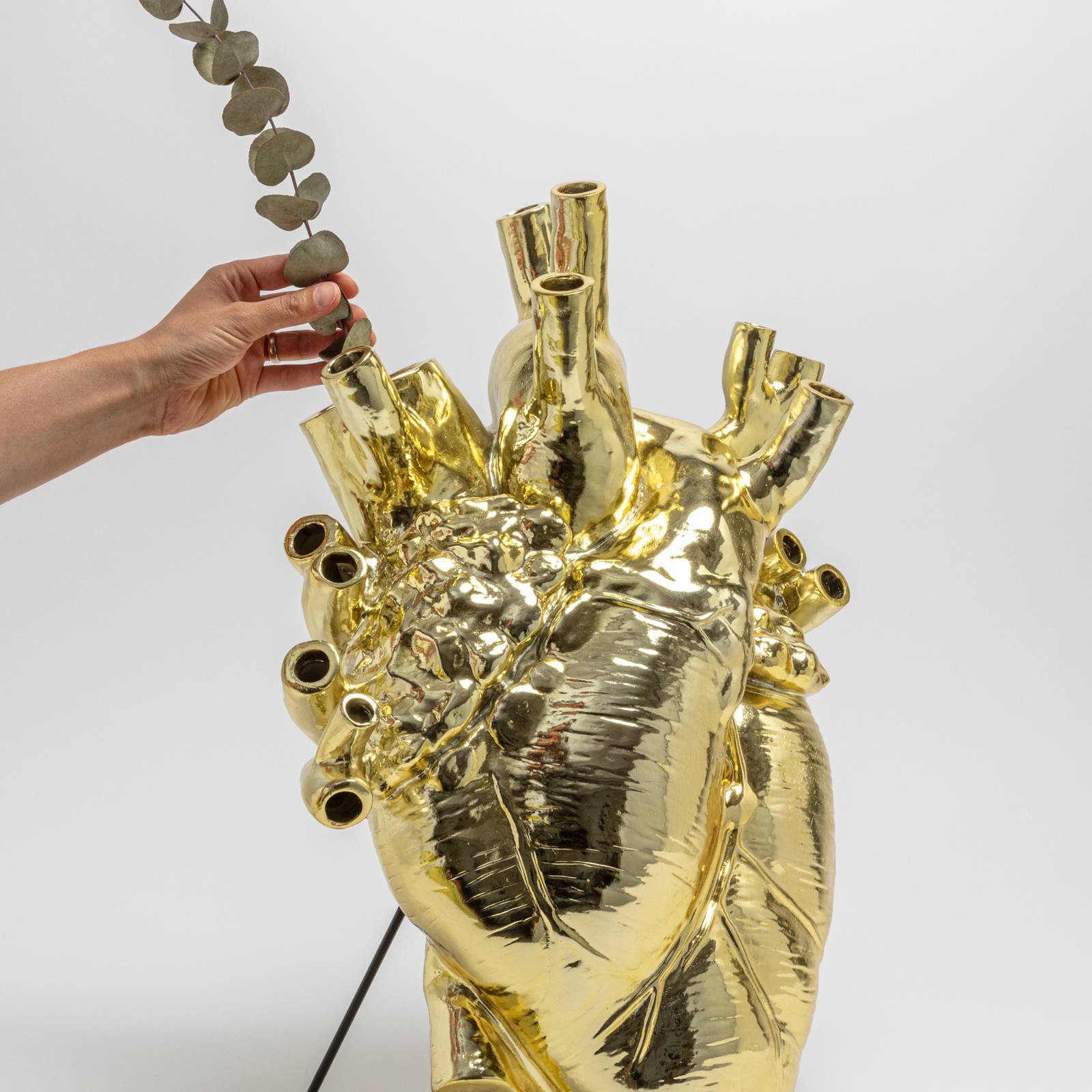 Plantenpot en sculptuur in één: goudkleurige Love in Bloom vaas van hoogwaardig porselein van SELETTI Love in Bloom is een hartvormige vaas die eruitziet alsof hij uit een essay over menselijke anatomie komt. Een moderne liefde vertaald in een romantisch maar onvoorspelbaar cadeau. Het is geen droom, het is liefde in bloei. Het is geen lente, het is liefde in bloei. Inclusief standaard en geschenkdoos.