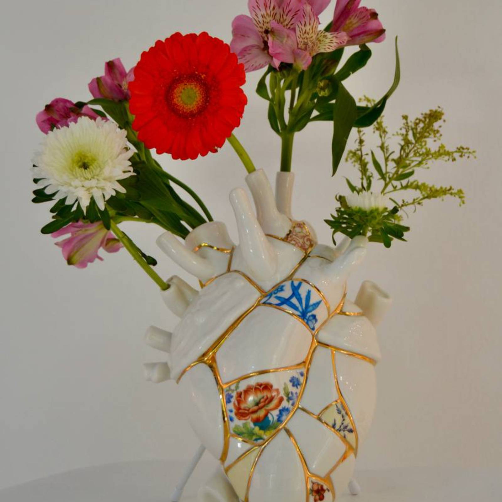 Love in Bloom Kintsugi vaas van porselein met gouden details Met de Love in Bloom Kintsugi vaas steekt de Italiaanse fabrikant SELETTI de bloemen figuurlijk door de aderen in het hart, alsof het hart de bloembol is waaruit de knoppen van de emotie bloeien. Een hart dat als bijna niets anders het leven symboliseert, vertelt ons nu zijn verhaal met een sterke identiteit en esthetiek met zijn fragmenten verbonden door lijnen van goud. Inclusief standaard en geschenkverpakking.