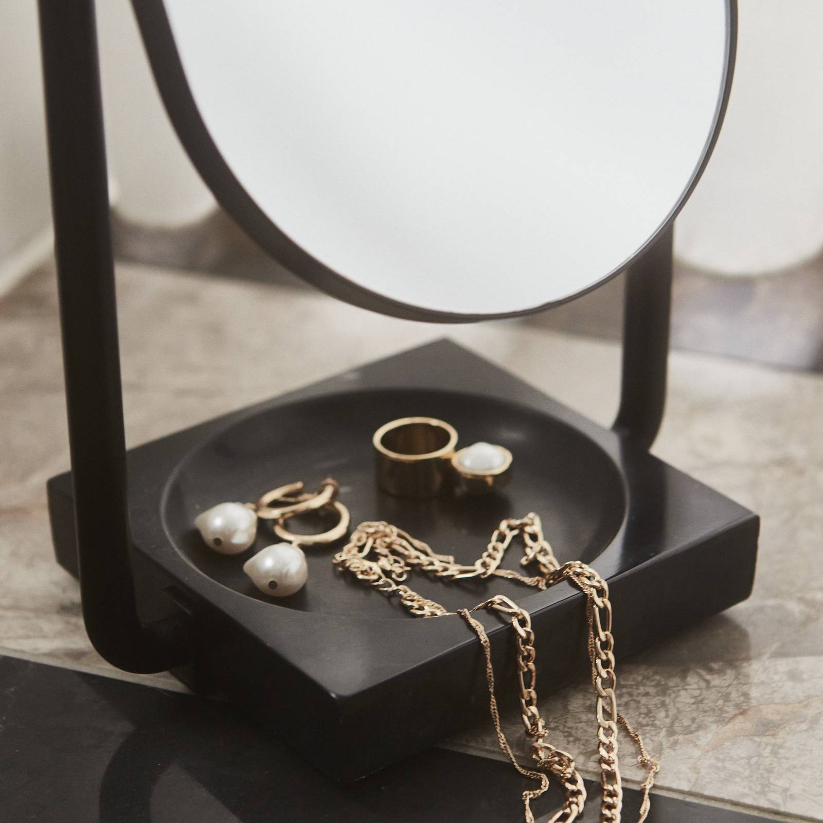 aan 2 zijden gespiegeld, achterzijde met vergrotend effect: de Angui draaibare tafelspiegel met marmeren voet De vormen van de Angui tafelspiegel zijn gemaakt om te experimenteren met de organische en sierlijke bewegingen van een slang. Je kunt deze tafelspiegel moeiteloos op je slaapkamertafel, badkamerstandaard of zelfs als extra reflectie voor je kaptafel plaatsen. De stijlvolle en functionele tafelspiegel is dubbelzijdig en kan eenvoudig worden omgedraaid naar een 1:3 vergrootglas aan de achterkant, wat de ideale reflectie is voor dagelijkse make-up. De onderkant van de Angui tafelspiegel is voorzien van een gebogen fitting voor het opbergen van je favoriete sieraden. Bovendien wordt deze tijdloze tafelspiegel geleverd in een geschenkdoos. product opmerkingen: Gemaakt van staal, glas en marmer. Aan beide zijden gespiegeld. Draaibaar. Achterzijde dient als vergrootglas (1:3) Onderhoudsinstructies: Gebruik glasreiniger op de spiegel om vuil en stof te verwijderen. Wrijf de spiegel droog en glanzend. Vermijd wrijven met een ruwe doek omdat dit het oppervlak kan beschadigen. Sommige reinigingsmiddelen kunnen strepen achterlaten op het glas, dus gebruik een middel dat geschikt is voor glas.