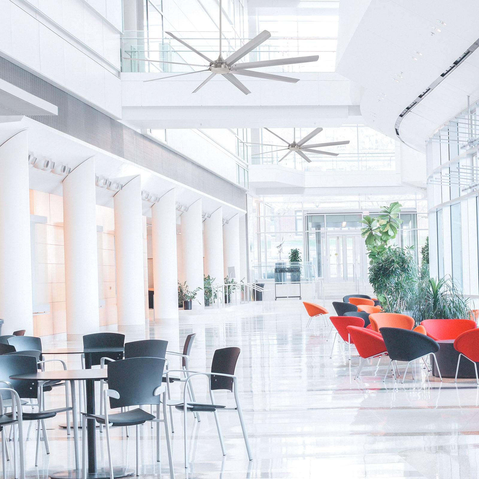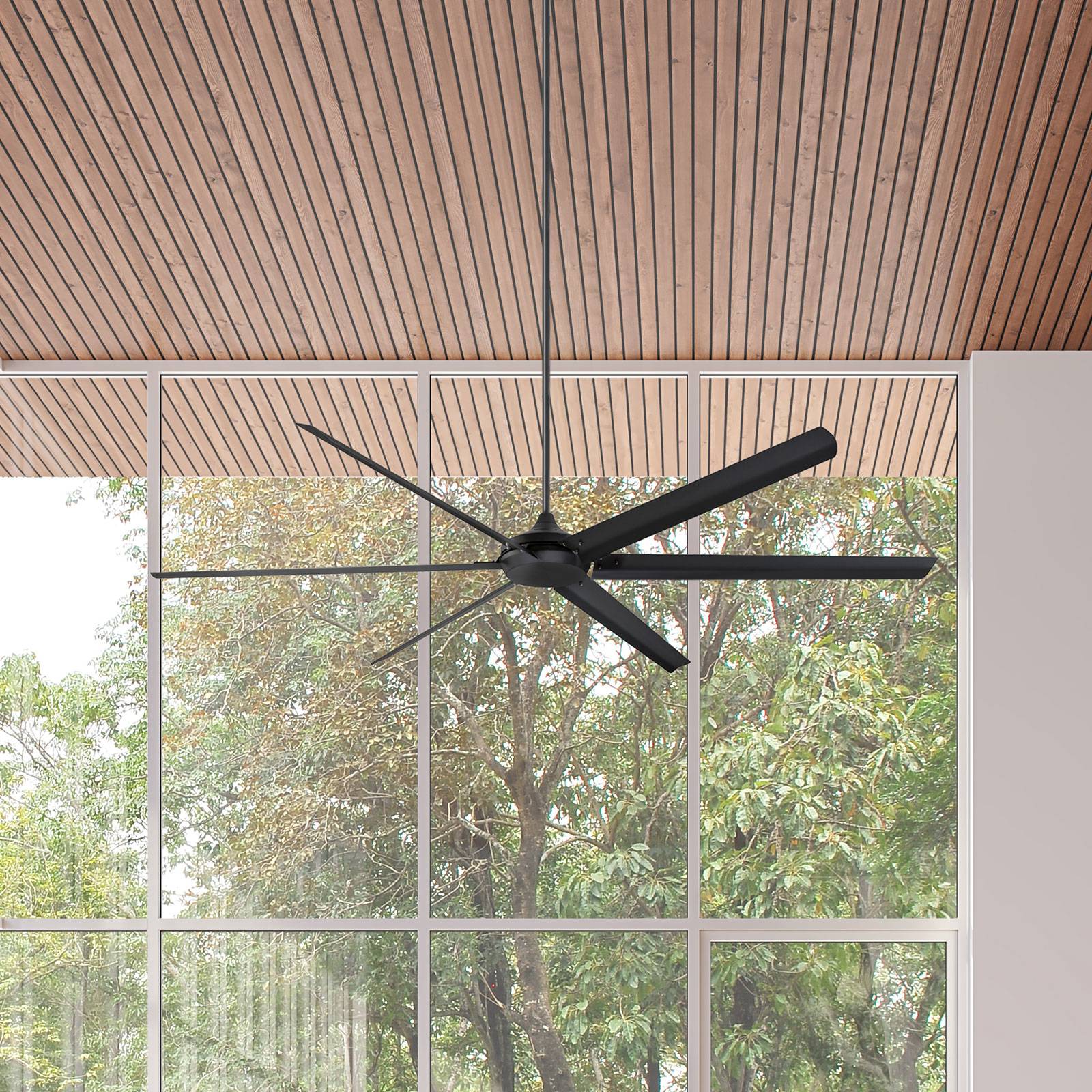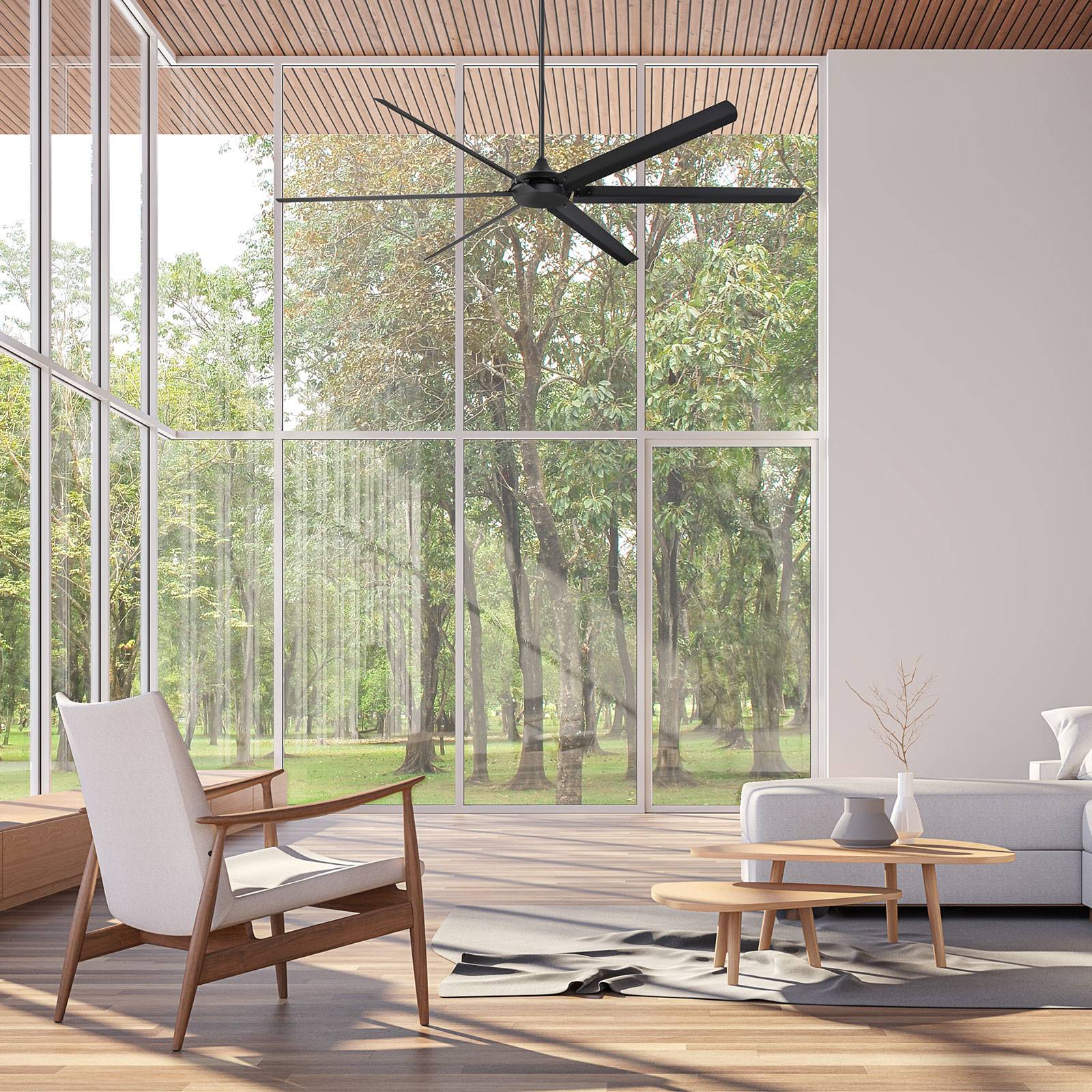 Plafondventilator Widespan overtuigt met grote spanwijdte De matzwart gelakte plafondventilator Widespan is uitgerust met zes bladen van aluminium. Hij heeft een enorme overspanning van meer dan 250 cm, waardoor hij vooral geschikt is voor grote woon- en werkruimten. Widespan verplaatst grote hoeveelheden lucht bij relatief weinig omwentelingen per minuut. Samen met een hoogwaardige gelijkstroommotor resulteert dit in een bijzonder stille en efficiënte werking. Dankzij de doeltreffende luchtverdeling kunnen magazijnen, zolders of werkplaatsen probleemloos worden gekoeld. Er moet echter rekening mee worden gehouden dat een installatiehoogte van ten minste 3,05 m boven de vloer mogelijk moet zijn. Inclusief afstandsbediening. Functies De ventilator wordt bediend via de geïntegreerde trekschakelaars of via de meegeleverde afstandsbediening. Het is mogelijk om via een schakelaar op de behuizing om te schakelen naar rechtsom of linksom draaien, waardoor de ventilator geschikt is voor zomer- en winterbedrijf. De motor heeft zes snelheidsniveaus. Montage alleen met bijgeleverde verlengstang. De montagehoogte moet ten minste 3,05 m boven de vloer van het blad zijn Technische gegevens - max. 118 watt - luchtstroom 891 m³/min - max. 75 rpm - kantelhoek van het blad: 17° - geschikt voor ruimtes vanaf 36 m² - geluidsniveau 43 db(A)