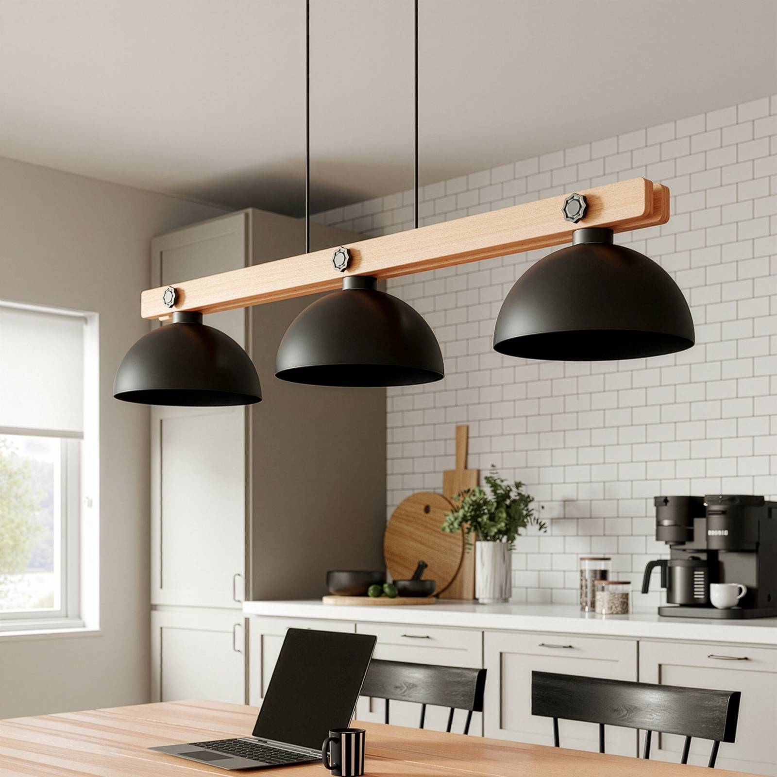 Drie-lamps hanglamp Stort met metalen kappen op natuurlijk hout - duurzaam In hanglamp Stort zijn natuurlijk hout en zwart gelakt metaal gecombineerd tot een lamp die in vele interieurs kan worden geïntegreerd, van landhuisstijl tot industriële en Scandinavische stijl. De zwarte metalen kappen stralen het licht direct naar beneden, zodat de Stort hanglamp een lange tafel perfect verlicht. De lampen van het merk Envostar worden in Europa vervaardigd. Dit betekent kortere transportroutes, wat resulteert in een aanzienlijke vermindering van de bijbehorende CO2-uitstoot. De Stort hanglamp wordt geleverd in een duurzame, 100% plastic-vrije verpakking.