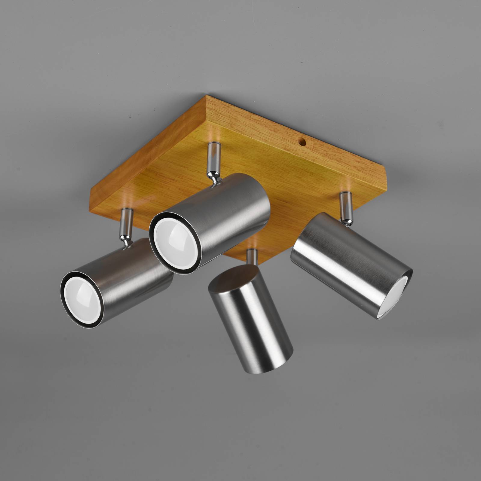4-lamps Marley plafondspot met houten baldakijn Dankzij de houten baldakijn en metalen lampenkoppen combineert de Marley plafondspot moderniteit en natuurlijkheid, waardoor hij een bijzonder tijdloze uitstraling heeft. Dankzij het discrete en elegante kleurenschema past de armatuur in elke woonomgeving. Marley kan op verschillende manieren worden gebruikt en is bijvoorbeeld geschikt voor gebruik in de woon- of eetkamer, in de gang of in de slaapkamer. De vier lampenkoppen spotten gericht licht en zijn ideaal om specifieke objecten of gebieden uit te lichten. Ze kunnen ook flexibel gedraaid of gezwenkt worden om de gewenste locatie optimaal te verlichten.