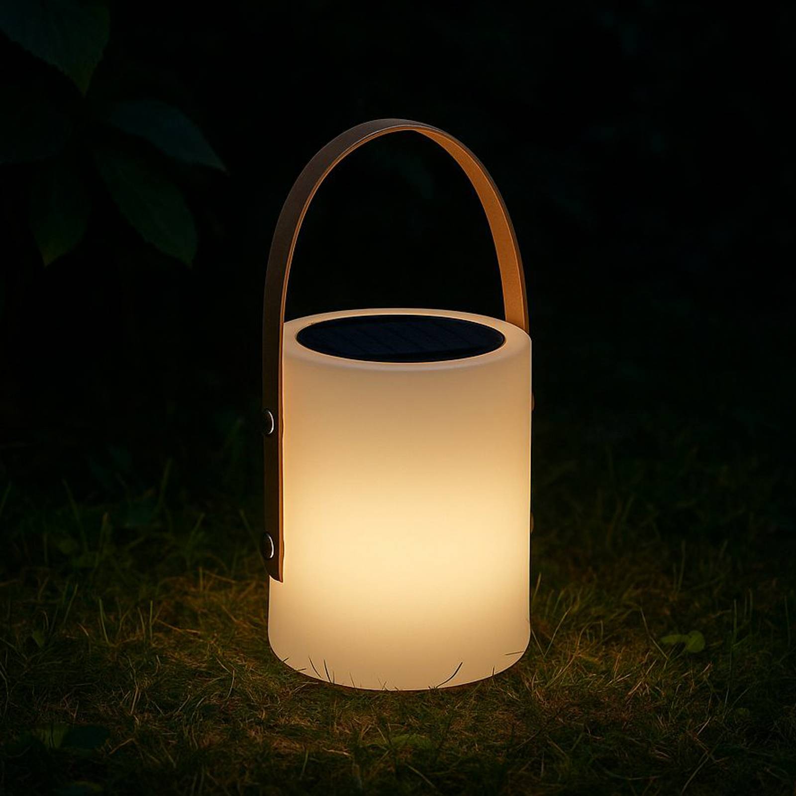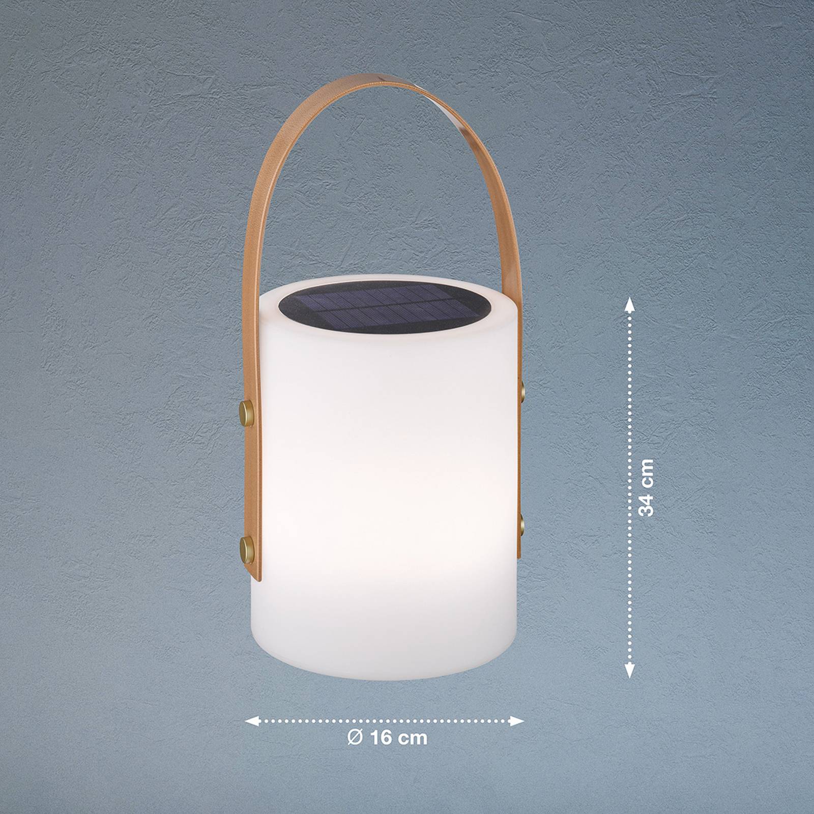 LED solar tafellamp Bari met dimmer en RGB kleurwisselaar Aan de bovenkant van de LED tafellamp Bari is een solar module bevestigd, die zonne-energie opslaat en de ingebouwde LED lamp laat gloeien. De lamp is gemaakt van wit plastic en heeft een bruine draagband. Het heeft ook IP44 bescherming en is daarom ideaal voor buitengebruik. De helderheid van de tafellamp kan in drie stappen worden ingesteld (30% - 60% - 100%). Bari heeft ook een RGB-kleurwisselfunctie in zeven kleurniveaus. De functies kunnen worden geselecteerd met de meegeleverde afstandsbediening.