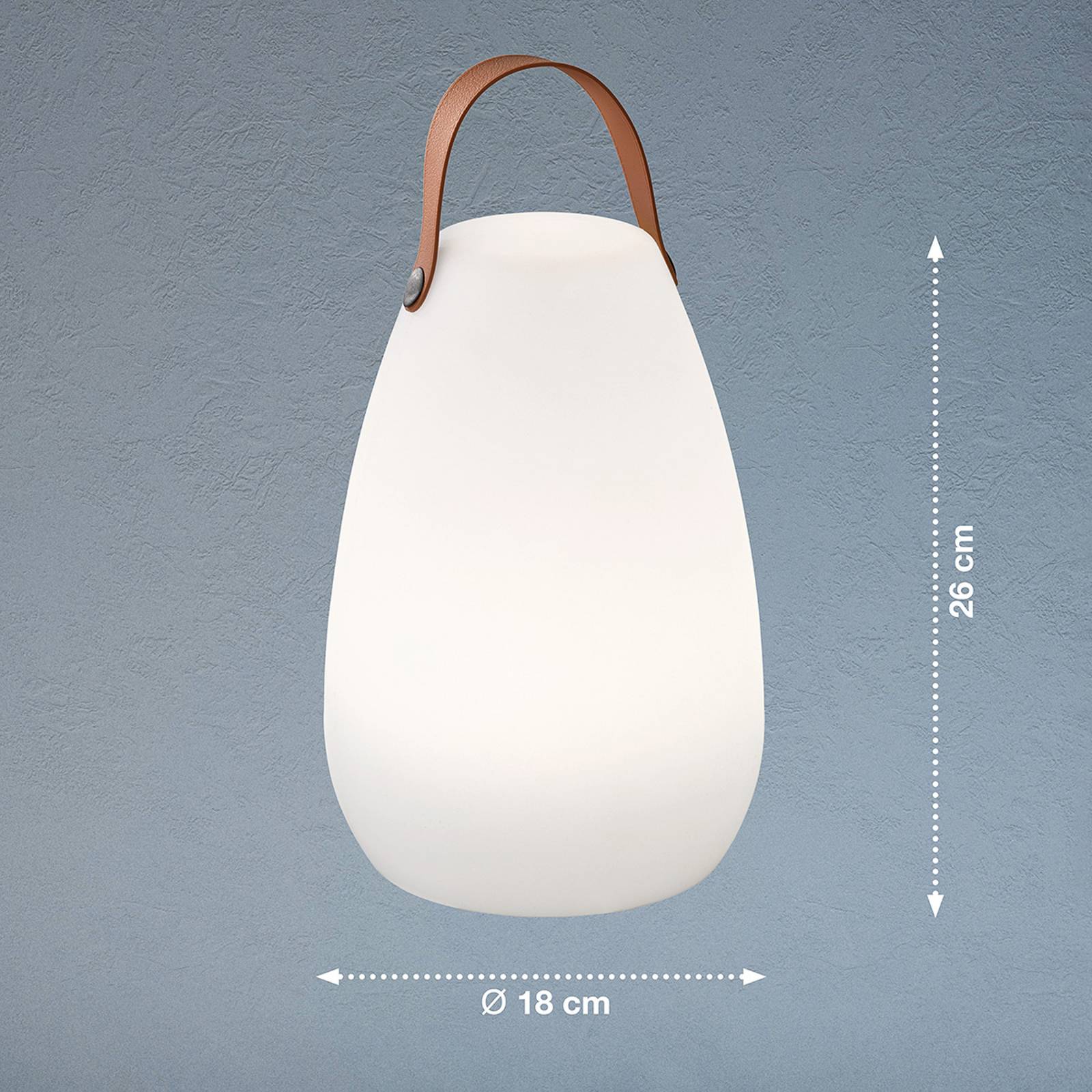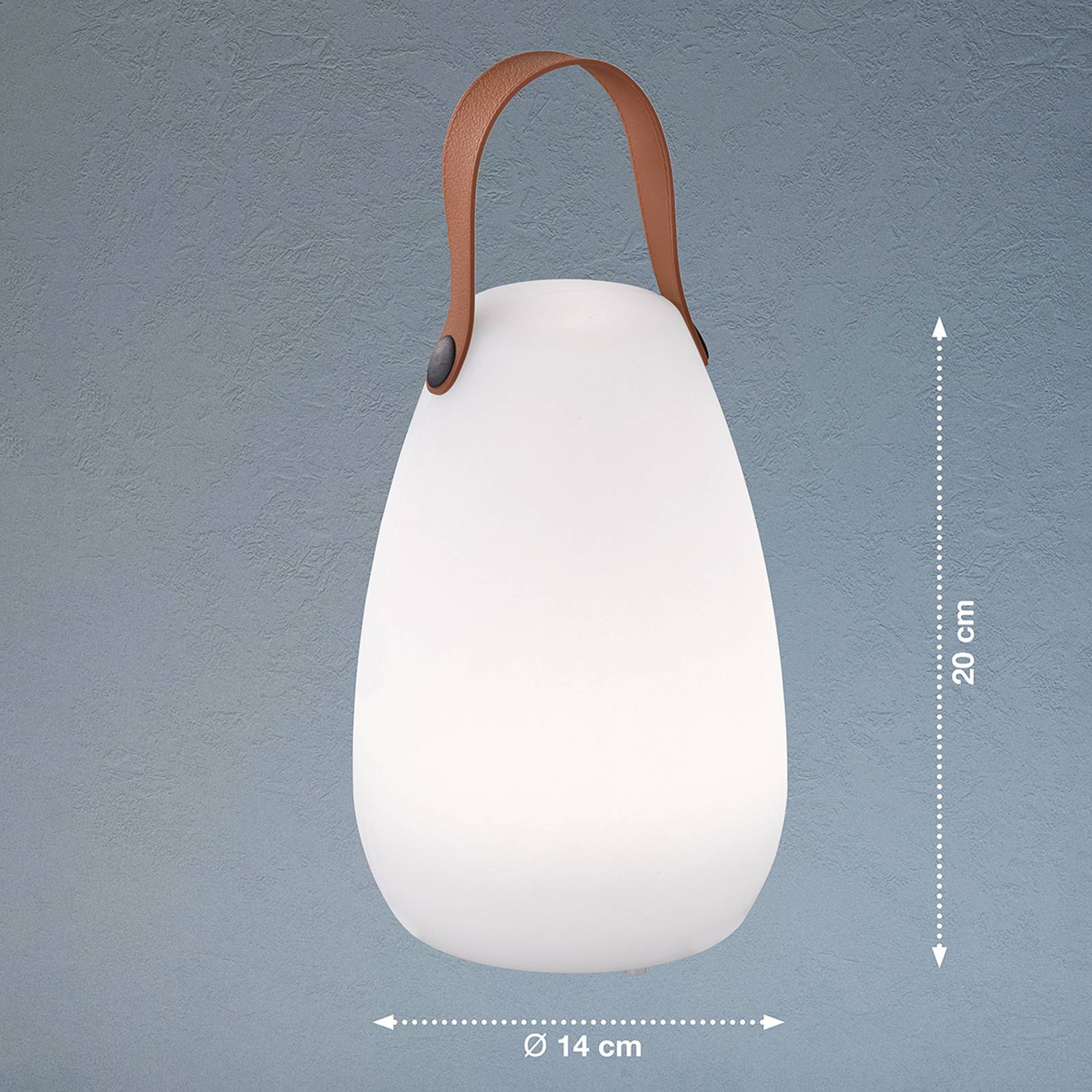 Draagbare LED tafellamp Ruby met afstandsbedieningDe LED tafellamp Ruby is gemaakt van wit kunststof en een bruine draagriem die aan de bovenkant van de lamp is bevestigd. Met IP44-bescherming is Ruby een ideale metgezel voor uitstapjes buitenshuis of een mooie aanvulling op het balkon, terras of de tuin. De lamp heeft een geïntegreerde oplaadbare batterij die met de meegeleverde kabel kan worden opgeladen in een droge ruimte binnenshuis. Met de meegeleverde afstandsbediening kun je de praktische functies van de lamp bedienen: Ruby heeft zowel een 3-traps dimfunctie als een RGB-kleurwisselfunctie.- 3-traps dimmer (30% - 60% - 100%)- RGB-kleurwissel in 7 stappen