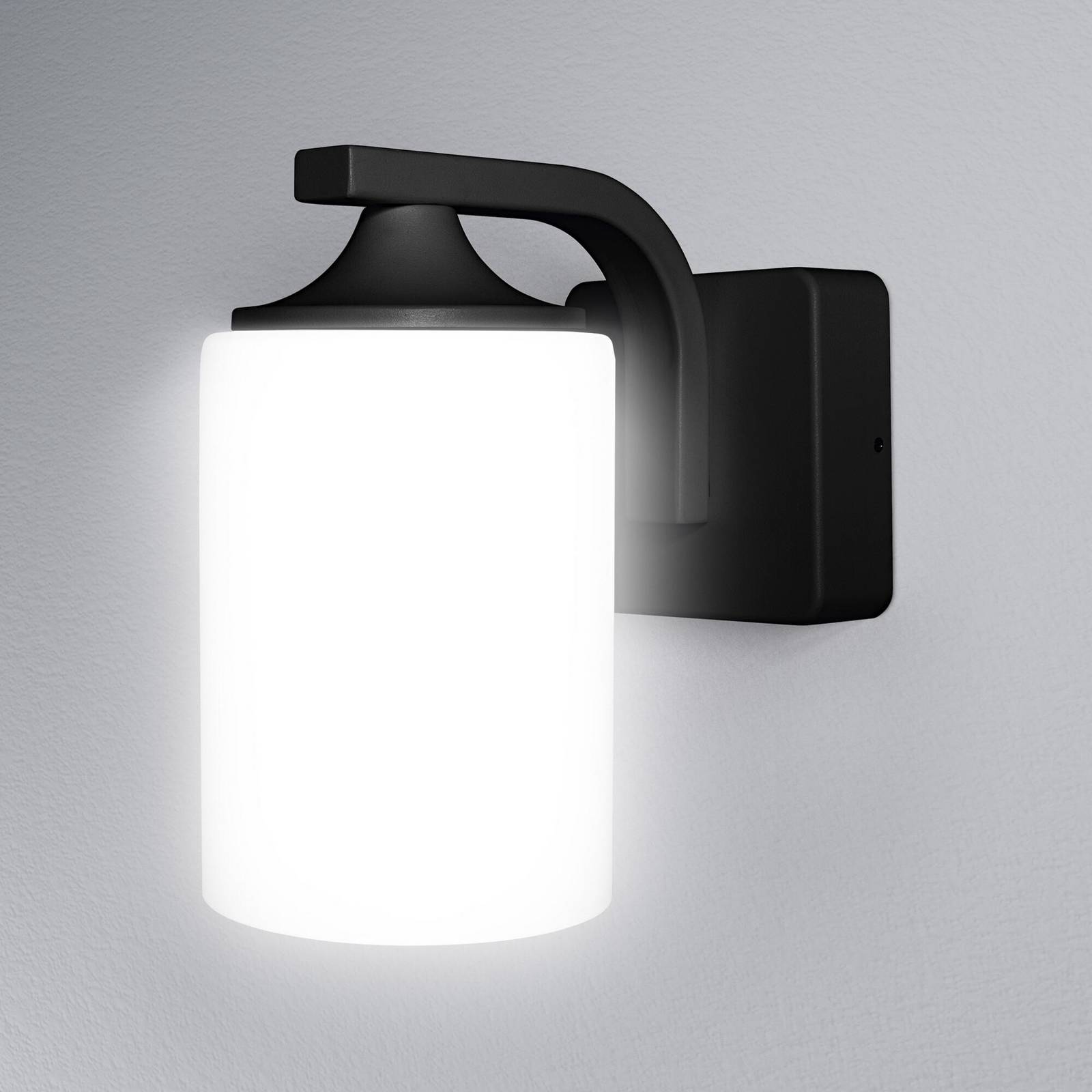 Wandlampen, cilindervormig met glazen diffuser. Productkenmerken: Diffuser van mat glas. Behuizing van gegoten aluminium. Beschermingsgraad: IP43. Productvoordelen: Grote flexibiliteit bij de keuze van de lamp dankzij E27-fitting. Eenvoudige en snelle installatie. Toepassingsgebieden: Entreeverlichting. Terrassen, balkons. Technische uitrusting: complete montage- en aansluitaccessoires inbegrepen. Geen lamp meegeleverd. Veiligheidsinstructies: Alle elektrische aansluitingen mogen alleen door gekwalificeerd personeel worden uitgevoerd. Let op, gevaar voor elektrische schokken. Product van beschermingsklasse I. Alle elektrisch geleidende, metalen behuizingsdelen die tijdens het gebruik of tijdens onderhoud in geval van een storing spanning kunnen opnemen, moeten continu met het aardedraad zijn verbonden.