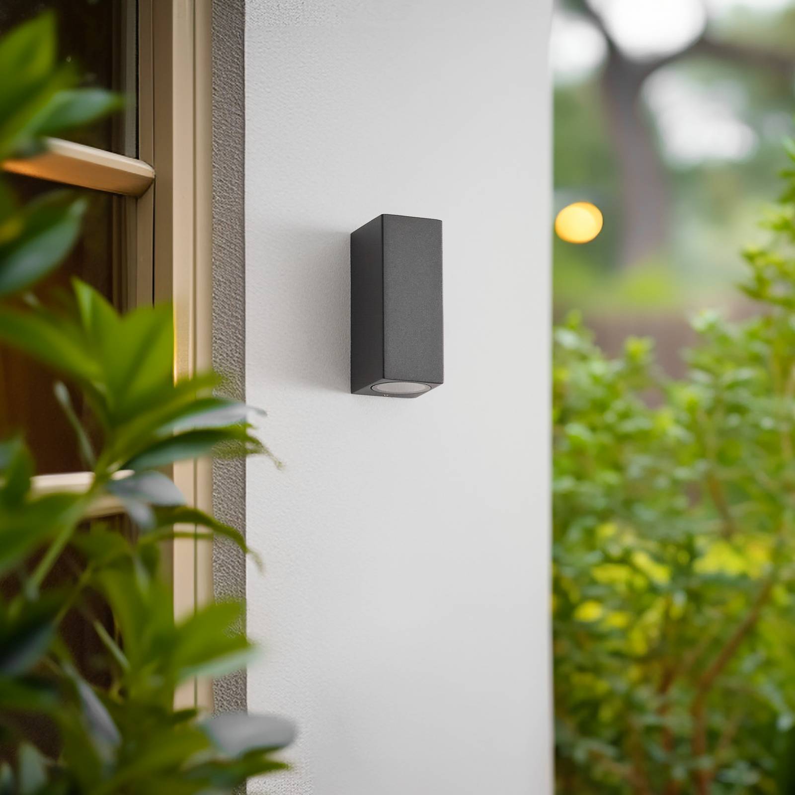 Buitenwandlamp Xava voor gebruik met GU10 lamp Xava heeft een hoekige armatuur armatuur armatuur armatuur die eruit ziet als een kubus en heeft een moderne en tijdloze uitstraling dankzij de duidelijke designtaal. Het oppervlak van het gegoten aluminium frame heeft een grafietgrijze afwerking in de traditie van koele elegantie. De lichtuitstraling van deze buitenwandlamp is naar beneden gericht. Een prachtige aanwinst voor vele omgevingen.