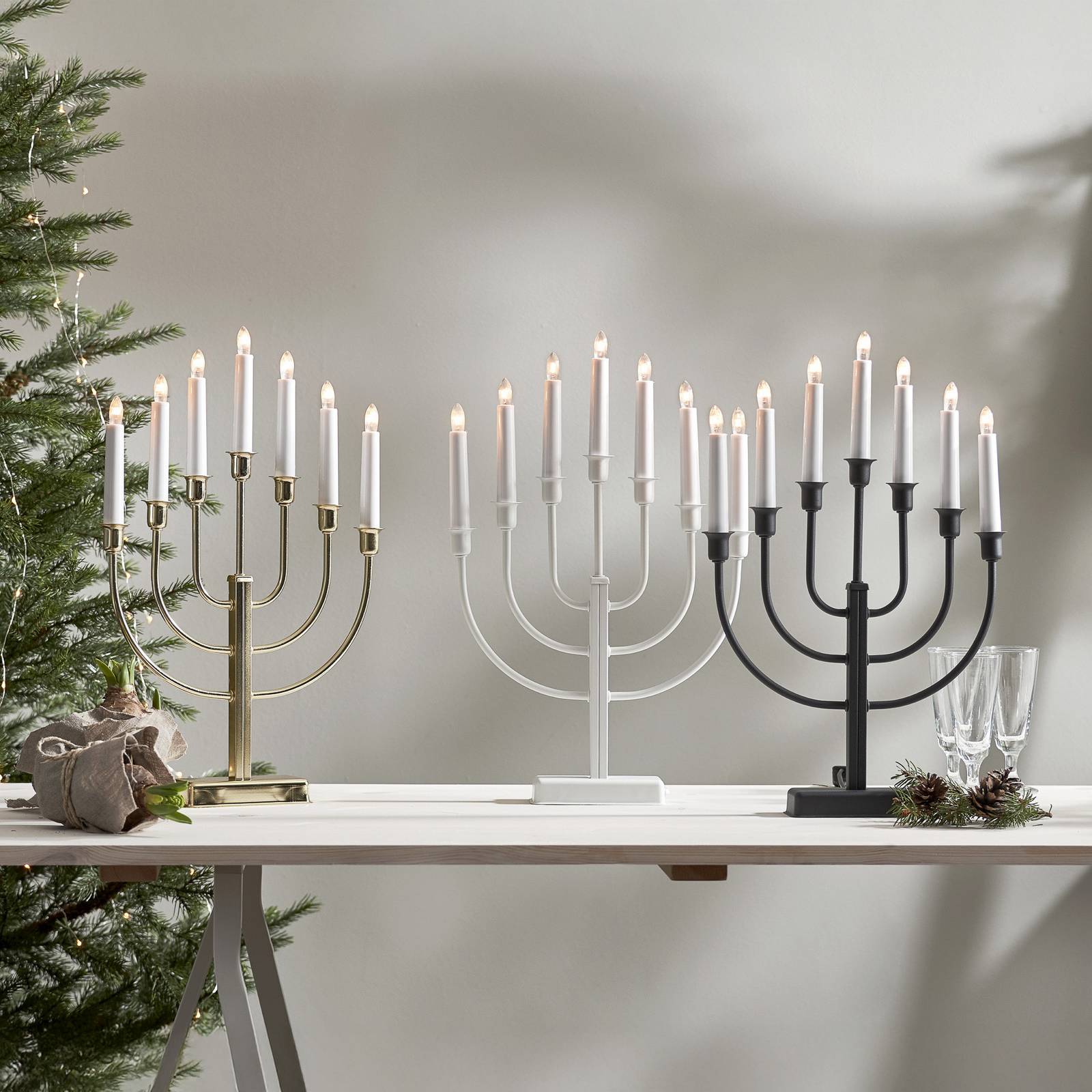 Kristina kandelaar met zeven witte kaarsen Deze kandelaar met metalen behuizing kan worden gebruikt om een elegante feestelijke sfeer te creëren. Hij maakt van de mooiste viering van het jaar een echt pronkstuk. Met zeven witte plastic kaarsen, elk met een E10 gloeilamp als vlam, zorgt Kristina voor een sfeervolle verlichting die accenten zet. Voorzien van schakelaar - Stekkersnoer: 1,8 m