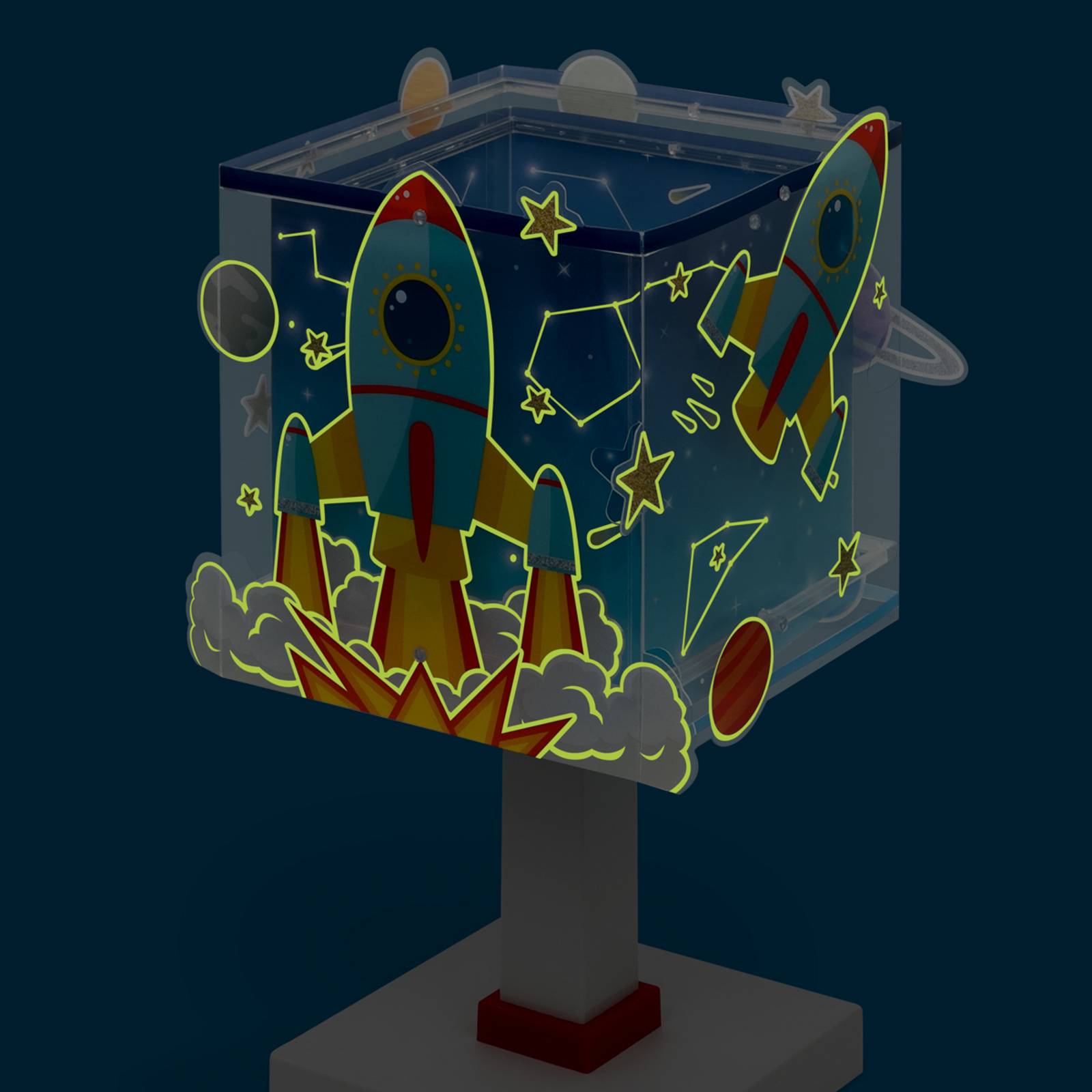 Kindertafellamp Rocket inclusief G4-lamp, zelflichtende kap De kindertafellamp Rocket heeft een hoekige kap en combineert een bijzonder ontwerp met functionele eigenschappen die speciaal zijn ontwikkeld voor gebruik in kinderkamers. De lamp is gemaakt van robuust, brandvertragend polypropyleen en ABS en overtuigt door zijn hoogwaardige afwerking en duurzaamheid. De warmwitte lichtkleur zorgt voor een aangename sfeer die zowel uitnodigt tot spelen als tot ontspannen. Een bijzonder hoogtepunt van de lamp is de fluorescerende inkt, die voor een magisch effect zorgt. Schakel de lamp hiervoor 5 tot 10 minuten in om de tint op te laden. Deze functie ziet er niet alleen geweldig uit, maar geeft ook een gevoel van veiligheid. Met zijn doordachte ontwerp en praktische eigenschappen is de Rocket-tafellamp voor kinderen een functioneel en decoratief element in elke kinderkamer. De lamp wordt bovendien geleverd met een bijpassende G4-lamp. - Bijzonderheden: - licht op in het donker - met G4-fitting inclusief LED lamp - bijzonder motief - gemaakt van brandvertragend polypropyleen en ABS