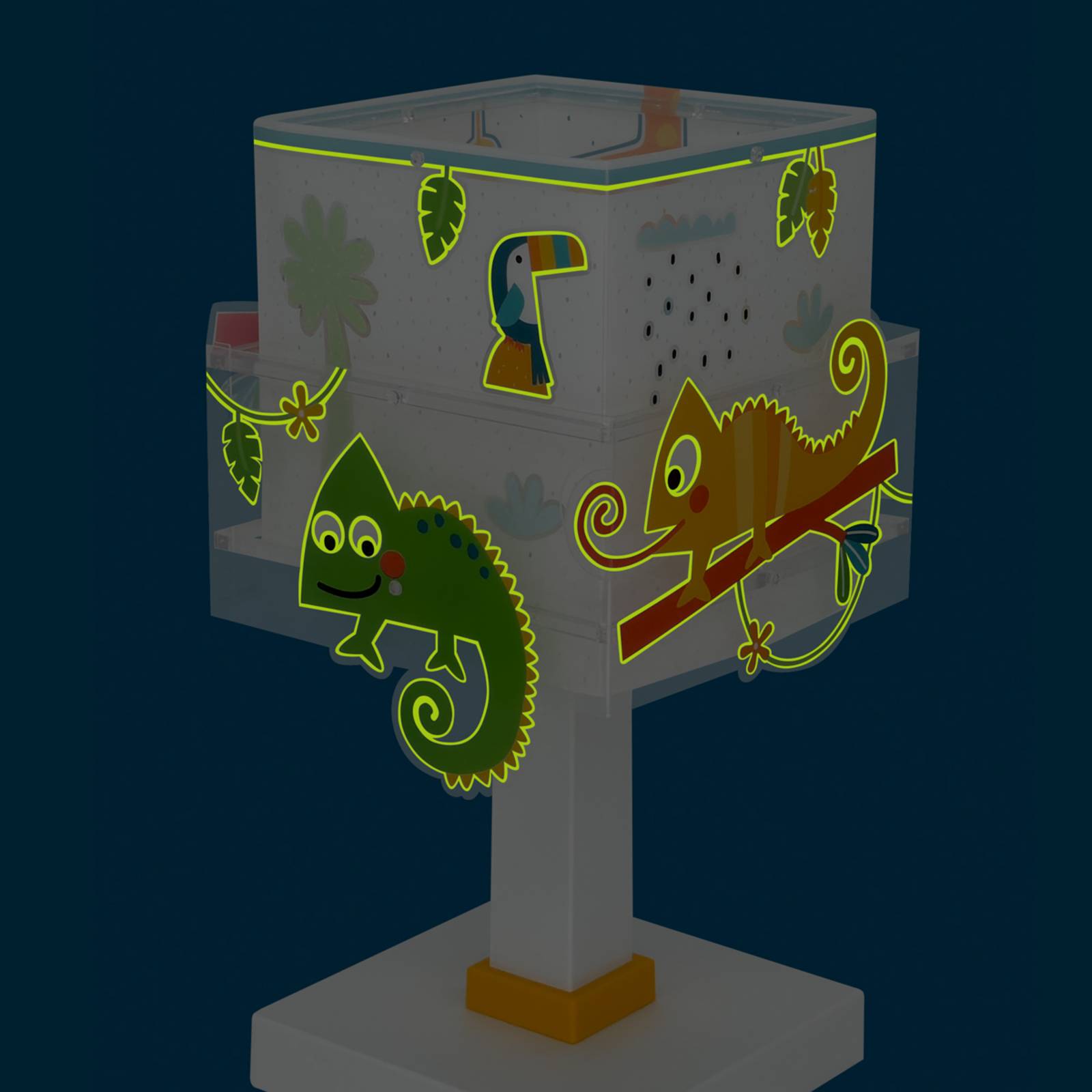 Kindertafellamp Baby Jungle inclusief G4-lamp, nagloeiende lampenkap De kindertafellamp Baby Jungle heeft een hoekige kap en combineert een bijzonder ontwerp met functionele eigenschappen die speciaal zijn ontwikkeld voor gebruik in de kinderkamer. Hij is gemaakt van robuust, brandvertragend polypropyleen en ABS en overtuigt door zijn hoogwaardige afwerking en duurzaamheid. De warmwitte lichtkleur zorgt voor een aangename sfeer die zowel uitnodigt tot spelen als tot ontspannen. Een bijzonder hoogtepunt van de lamp is de fluorescerende inkt, die voor een magisch effect zorgt. Schakel de lamp hiervoor 5 tot 10 minuten in om de tint op te laden. Deze functie zorgt niet alleen voor een geweldig uiterlijk, maar creëert ook een gevoel van veiligheid. Met zijn doordachte ontwerp en praktische eigenschappen wordt de Baby Jungle kindertafellamp een functioneel en decoratief element in elke kinderkamer. De lamp wordt bovendien geleverd met een bijpassende G4-lamp. - Bijzonderheden: - licht op in het donker - met G4-fitting inclusief LED lamp - bijzonder motief - gemaakt van brandvertragend polypropyleen en ABS