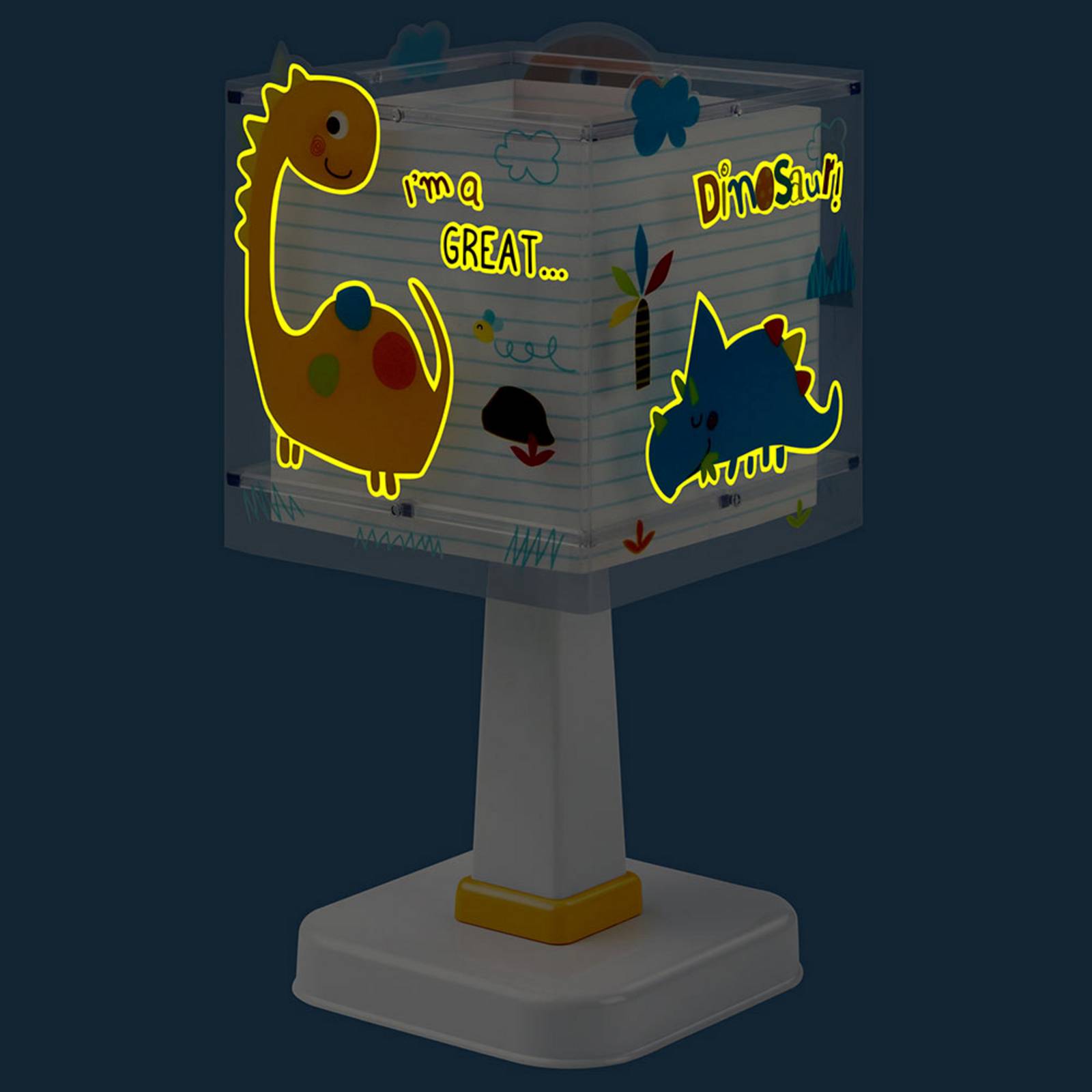 Kinderkamer tafellamp Dinos inclusief G4-lamp, zelflichtende kap De kinderkamer tafellamp Dinos heeft een hoekige kap en combineert een bijzonder ontwerp met functionele eigenschappen die speciaal zijn ontwikkeld voor gebruik in de kinderkamer. Hij is gemaakt van robuust, brandvertragend polypropyleen en ABS en overtuigt door zijn hoogwaardige afwerking en duurzaamheid. De warmwitte lichtkleur zorgt voor een aangename sfeer die zowel uitnodigt tot spelen als tot ontspannen. Een bijzonder hoogtepunt van de lamp is de fluorescerende inkt, die voor een magisch effect zorgt. Schakel de lamp hiervoor 5 tot 10 minuten in om de tint op te laden. Deze functie zorgt niet alleen voor een geweldig uiterlijk, maar creëert ook een gevoel van veiligheid. Met zijn doordachte ontwerp en praktische eigenschappen wordt de Dinos-tafellamp voor kinderen een functioneel en decoratief element in elke kinderkamer. De lamp wordt bovendien geleverd met een bijpassende G4-lamp. - Bijzonderheden: - licht op in het donker - met G4-fitting inclusief LED lamp - bijzonder motief - gemaakt van brandvertragend polypropyleen en ABS