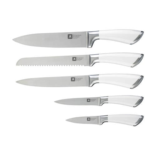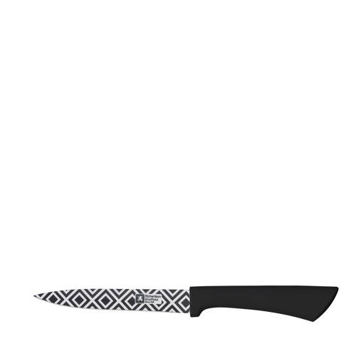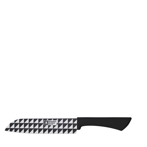 Dit 5-delige messenblok van Richardson Sheffield heeft een origineel design op het lemmet. De zwart-witte print komt in het doorzichtige messenblok goed tot zijn recht. Het lemmet heeft een non-stick coating wat ervoor zorgt dat voedsel niet aan de bladen blijft plakken, hierdoor zijn de messen fijn in gebruik en zijn deze eenvoudig schoon te maken. Het heft is gemaakt van zacht materiaal, zodat je een comfortabele grip op de messen hebt. De set bestaat uit de volgende keukenmessen: - 196 Vlees mesPerfect voor het snijwerk van grote stukken vlees, fruit en groenten. Lemmet: 20 cm Totale lengte: 33,5 cm- 191 BroodmesMet het gegolfde lemmet snijd je moeiteloos door de korst van het brood en kun je mooie plakken brood afsnijden, zonder het brood te scheuren.Lemmet: 20 cm Totale lengte: 33 cm- 161 Santuko mesEen Japans type mes waar je zeer precies mee kunt werken en vlees of groenten flinterdun mee kunt snijden. Lemmet: 17,5 cm Totale lengte: 31 cm- 116 HuishoudmesEen veelzijdig mes voor het snijden van vlees en groenten.Lemmet: 13 cmTotale lengte: 24,5 cm- 117 SchilmesjeHet schilmesje is ideaal voor het schillen en snijden van fruit en zachte groente.Lemmet: 8,5 cmTotale lengte: 20 cm