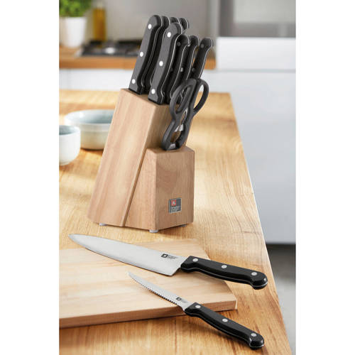 De messen uit het Laser Soft Touch messenblok van het merk Richardson Sheffield beschikt over een laser technologie waardoor de messen vlijmscherp zijn en deze niet geslepen hoeven te worden.Lemmet: Het door laser technologie bewerkte lemmet is gemaakt van hoogwaardig roestvrij messenstaal. De laser technologie kan herkend worden aan de gekartelde snijrand met micro-golven.Heft: Door het gebruik van het 'zachtere' materiaal in het heft, heeft u een veilige en goede grip. Hierdoor ligt het mes perfect in de hand.Messenblok:Het zwarte messenblok bestaat uit:117 Schilmes lemmet: 9 cm 116 Huishoudmes lemmet: 11 cm191 Broodmes lemmet: 20 cm 196 Vleesmes lemmet: 20 cm114 Koksmes: 15 cmOnderhoudsinstructies Deze messen van Richardson Sheffield zijn vaatwasmachine bestendig. Voor een langere levensduur van de messen raden wij aan de volgende onderhoudsinstructies te volgen.Ter voorkoming van vlekvorming adviseren wij het volgende:- Spoel de messen met water af alvorens deze in de vaatwasser worden geplaatst.- In verband met mogelijke 'contactcorrosie' (veroorzaakt door aanraking van verschillende soorten metaal) raden wij aan de messengescheiden van andere metalen in de vaatwasser te plaatsen. - Gebruik niet teveel afwas-/naglansmiddel, omdat deze bijtend zijn. - Wanneer het vaatwasprogramma is afgelopen, open dan de deur om condensatie op de messen te voorkomen. - Wrijf bij voorkeur de messen droog zodra het vaatwasprogramma beëindigd is.