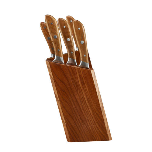 Dit 5-delige messenblok is van het merk Richardson Sheffield. Door natuurlijke materialen te combineren met een uitzonderlijk design, brengt het Scandi messenblok het klassiek minimalisme in het hart van uw huis. • Massief essenhout messenblok• Inclusief 5 messen, dus een complete messenset• Uniek ontwerp• Natuurlijke materialen en voelbare houtnerven in het blok en heft• Geklonken heft voor extra stabilieit en duurzaamheid• MoV staal voor hoge hardheid• Taps toelopend lemmet om met precisie te snijden• Duurzame en uitgebalanceerde messen voor extra snijcomfortHet 5-delig messenblok wordt geleverd inclusief:SchilmesIdeaal voor het schillen van fruit en zachte groentenLemmet: 9 cm, totale lengte 21 cmHuishoudmesEen zeer veelzijdig mes voor het portioneren van vlees en groenten.Lemmet: 12,5 cm, totale lengte 24 cmKoksmes Een mes met vele toepassingen, met een breed uitlopend lemmet dat de mogelijkheid geeft om het mes te laten schommelen tijdens het snijden.Lemmet: 20 cm, totale lengte 32,5 cmVleesmesPerfect voor het snijwerk en in plakken snijden van grotere stukken vlees, groter fruit en groenten en gevogelte.Lemmet: 20 cm, totale lengte 33 cmBroodmesMet het gegolfde lemmet snijdt u moeiteloos door de korst van het brood en snijdt u mooie plakken af, zonder het brood te scheuren.Lemmet: 20 cm, totale lengte 33 cm