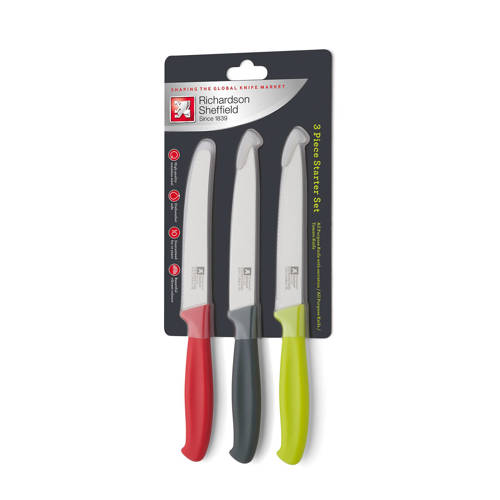 Het merk Richardson Sheffield staat garant voor innovatieve producten van hoge kwaliteit. De ontwerpen van het merk zijn origineel en onmisbaar in de hedendaagse keuken. Deze messen zijn gemaakt van topkwaliteit Chrome Molybdenum Vanadium roestvrij messenstaal. Dit type staal zorgt voor een hoge hardheid en superscherpe messen, welke ook nog eens beter bestand zijn tegen vlekvorming. De messen hebben een ergonomisch ontworpen heft waardoor de messen prettig in de hand liggen.De messen hebben een mooie heldere groene, rode en grijze kleur heft wat zorgt voor een vrolijke noot in uw keuken. De 3-delige set bestaat uit de volgende messen: Schilmes gebogen: Ideaal voor het snijden en schillen van groenten. Lemmet: 7 cm. Totale lengte: 18 cm.Schilmes: Ideaal voor het schillen en snijden van groenten. Lemmet: 8 cm. Totale lengte: 20 cm. Huishoudmes met kartel: Een zeer veelzijdig mes voor het portioneren van vlees en groeten. Lemmet: 12 cm. Totale lengte: 23 cm.KwaliteitKwaliteit staat bij Richardson Sheffield hoog in het vaandel. Onze producten zijn gemaakt van chroom molybdeen vanadium roestvrij messenstaal met een hoog koolstof gehalte waardoor ze een hoge weerstand tegen corrosie (weerstand tegen roest) hebben, wat de producten ook geschikt maakt voor de vaatwasser. Voor onderhoudsinstructies zie de verpakking of de website van Amefa. De producten van Richardson Sheffield staan garant voor jarenlang plezier.