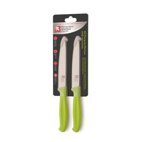 Het merk Richardson Sheffield staat garant voor innovatieve producten van hoge kwaliteit. De ontwerpen van het merk zijn origineel en onmisbaar in de hedendaagse keuken. Deze messen zijn gemaakt van topkwaliteit Chrome Molybdenum Vanadium roestvrij messenstaal. Dit type staal zorgt voor een hoge hardheid en superscherpe messen, welke ook nog eens beter bestand zijn tegen vlekvorming. De messen hebben een ergonomisch ontworpen heft waardoor de messen prettig in de hand liggen. De messen hebben een mooie heldere groene kleur heft wat zorgt voor een vrolijke noot in uw keuken. De 2 delige set bestaat uit twee huishoudmessen met kartel: een zeer veelzijdig mes voor het portioneren van vlees en groeten. Lemmet: 12 cm. Totale lengte: 23 cm.KwaliteitKwaliteit staat bij Richardson Sheffield hoog in het vaandel. Onze producten zijn gemaakt van chroom molybdeen vanadium roestvrij messenstaal met een hoog koolstof gehalte waardoor ze een hoge weerstand tegen corrosie (weerstand tegen roest) hebben, wat de producten ook geschikt maakt voor de vaatwasser. Voor onderhoudsinstructies zie de verpakking of de website van Amefa. De producten van Richardson Sheffield staan garant voor jarenlang plezier.