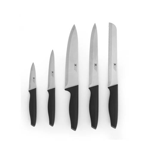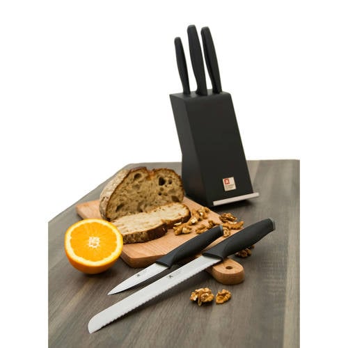 Advantage – 5-delige messenblok set – Richardson SheffieldDoor de gladde, zwarte afwerking zal dit Advantage-messenblok een moderne look toevoegen aan elke keuken. Het blok staat stevig op het aanrecht en de handige houder aan het blok is ideaal om een tablet of kookboek op te plaatsen. Een groot pluspunt voor elke beginnende chef-kok! Alle messen in het Advantage-assortiment zijn standaard voorzien van een antislip, comfortabele handgreep.• Zwarte, moderne afwerking• Met handige tablet of kookboekhouder• Messen met antislip handgreep voor extra snijcomfortDeze 5-delige messenset wordt geleverd inclusief:SchilmesIdeaal voor het schillen van fruit en zachte groenten.Lemmet: 9 cm, totale lengte 19,5 cmHuishoudmesEen zeer veelzijdig mes voor het portioneren van vlees en groenten.Lemmet: 12,5 cm, totale lengte 24 cmKoksmes 20 cmEen mes met vele toepassingen, met een breed uitlopend lemmet dat de mogelijkheid geeft om het mes te laten schommelen tijdens het snijden.Lemmet: 20 cm, totale lengte 32,5 cmVleesmesPerfect voor het snijwerk en in plakken snijden van grotere stukken vlees, groter fruit en groenten en gevogelte.Lemmet: 20 cm, totale lengte 32,5 cmBroodmesMet het gegolfde lemmet snijdt u moeiteloos door de korst van het brood en snijdt u mooie plakken af, zonder het brood te scheuren.Lemmet: 20 cm, totale lengte 33 cmDe lekkerste maaltijden worden bereid met Richardson SheffieldOf je nu een ambitieuze hobbykok bent of als chef-kok dagelijks maaltijden serveer, met de messen van Richardson Sheffield maak je de lekkerste maaltijden. En we zijn trots op onze Britse roots: Richardson Sheffield is ontstaan in het Engelse Sheffield. Al sinds 1839 zetten wij de norm voor de toekomst van de wereldwijde messenmarkt met onze iconische en toonaangevende producten. We maken messen voor iedereen, van toegankelijke startersets tot de hoogste kwaliteit professionele keukenmessen. Ons merk staat synoniem voor compromisloze kwaliteit, toonaangevend design en de laatste technische innovaties.Kwaliteit en onderhoudKwaliteit staat bij Richardson Sheffield hoog in het vaandel. Onze producten zijn gemaakt van chroom molybdeen vanadium roestvrij messenstaal met een hoog koolstof gehalte waardoor ze een hoge weerstand tegen corrosie (weerstand tegen roest) hebben, wat de producten ook geschikt maakt voor de vaatwasser. Voor onderhoudsinstructies zie de verpakking.De producten van Richardson Sheffield staan garant voor jarenlang plezier!