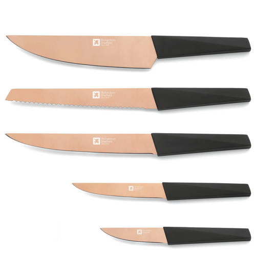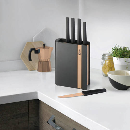 Richardson Sheffield – Edge Copper - 5-delig messenblok Edge Copper heeft een geometrisch messenblok. Een echte vorminnovatie die strakke lijnen naar een hoger niveau tilt. Een modern zwart/ koper blok met koper coating messen.• Massief houten messenblok met zwarte coating• Inclusief 5 messen, dus een complete messenset• Hoogwaardig roestvrij staal met zwarte coating• Moderne vormgeving• Geometrisch en ‘soft-touch’ heft• Taps toelopend lemmet om met precisie te snijden• Duurzame en uitgebalanceerde messen voor extra snijcomfortHet 5-delig messenblok wordt geleverd inclusief:SchilmesIdeaal voor het schillen van fruit en zachte groentenLemmet: 9 cm, totale lengte: 20,5 cmHuishoudmesEen zeer veelzijdig mes voor het portioneren van vlees en groenten.Lemmet: 12,5 cm, totale lengte: 24cmKoksmes Een mes met vele toepassingen, met een breed uitlopend lemmet dat de mogelijkheid geeft om het mes te laten schommelen tijdens het snijden.Lemmet: 20 cm, totale lengte: 33cmVleesmesPerfect voor het snijwerk en in plakken snijden van grotere stukken vlees, groter fruit en groenten en gevogelte.Lemmet: 20 cm, totale lengte: 33cmBroodmesMet het gegolfde lemmet snijdt u moeiteloos door de korst van het brood en snijdt u mooie plakken af, zonder het brood te scheuren.Lemmet: 20 cm, totale lengte: 33cm Kwaliteit en onderhoudHet wordt aangeraden deze messen met de hand af te wassen, zodat de kleur langer mooi blijft. Voor onderhoudstips zie de verpakking.De producten van Richardson Sheffield staan garant voor jarenlang plezier!