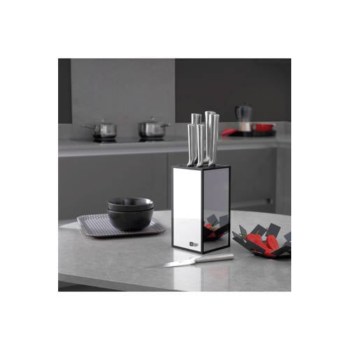 Voeg een beetje extra glamour toe aan je keuken met deze spiegelende messenblok met strak afgewerkte zwarte randen van het merk Richardson Sheffield. Het merk staat garant voor innovatieve producten van hoge kwaliteit. De modern vormgegeven roestvrijstalen messen maken het plaatje compleet en voegen samen met het messenblok een beetje glamour toe aan de keuken. Het messenblok heeft een zogenaamde flexibele binnenkant van plastic stengels. Hierdoor kunt u de keukenmessen, onafhankelijk van het type of vorm van het mes, op elke mogelijke manier in het blok plaatsen.De messen zijn van hoogwaardig roestvrij messenstaal waardoor ze een hoge weerstand tegen corrosie (weerstand tegen roest) hebben, wat de producten ook geschikt maakt voor de vaatwasser. Voor onderhoudsinstructies zie de verpakking.Lemmet: De messen zijn gemaakt van hoogwaardig roestvrij messenstaal, hierdoor blijven de messen scherp en het zorgt ervoor dat u extra precies kunt snijden. Het taps toelopende lemmet zorgt voor stabiliteit, duurzaamheid en grotere snij precisie. Heft:De messen hebben een ergonomisch ontworpen, ovaal heft. Dit zorgt er voor dat het mes comfortabel in de hand ligt. Samen met de eigenschappen van het lemmet zorgt dit alles voor een keukenmes waarmee het zeer plezierig werken is. Samenstelling 5-delig messenblok Visage:117 SchilmesjeIdeaal voor het schillen en snijden van fruit en zachte groenten.Lemmet: 8.5 cm Totale lengte: 20 cm.116 HuishoudmesEen zeer veelzijdig mes voor het portioneren van vlees en groenten.Lemmet: 12.5 cm Totale lengte: 23.5 cm.132 Koksmes Een mes met vele toepassingen, met een breed uitlopend lemmet dat de mogelijkheid geeft om het mes te laten schommelen tijdens het snijden.Lemmet: 20 cm Totale lengte: 34 cm.196 VleesmesPerfect voor het snijwerk en in plakken snijden van grotere stukken vlees, groter fruit en groenten en gevogelte.Lemmet: 20 cm Totale lengte: 33.5 cm.191 BroodmesMet het gegolfde lemmet snijdt u moeiteloos door de korst van het brood en snijdt u mooie plakken af, zonder het brood te scheuren.Lemmet: 20 cm Totale lengte: 33.5 cm.