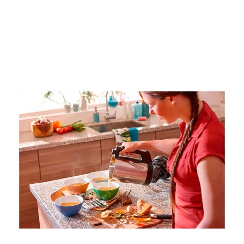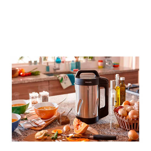 Met deze Philips HR2203/80 Viva Collection SoupMaker maak jij binnen enkele minuten soepen, compotes en smoothies. Dankzij een efficiënt verwarmingsvermogen van 1000 Watt is jouw soep klaar binnen 18 minuten. De SoupMaker heeft 5 standaardprogramma's waaronder dunne soep, dikke soep, compotes en smoothies. Je kunt hem ook als normale blender gebruiken. De SoupMaker wordt geleverd met receptenboekje en is na gebruik makkelijk schoon te maken.Specificaties:- Vermogen: 1000 Watt- Materiaal mes: RVS- Materiaal kan: RVS- Inhoud kan: 1.2 liter- Eenvoudige gebruikersinterface met 5 standaardinstellingen- Extra handmatige mengfunctie- Snoerlengte 100 cm- Kleur: zilver- Garantietermijn: 2 jaarAfmetingen en gewicht:- Afmetingen (hxbxd) 34.5x23x23 cm- Gewicht: 1.75 kg