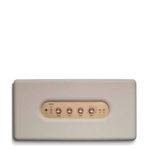 Marshall Woburn II Bluetooth speaker CrémeHet merk Marshall staat bekend om zijn speakers die zowel van binnen als van buiten klasse uitstralen, zo ook deze Woburn II Bluetooth speaker.Je bedient deze speaker, die uitermate goed geschikt is voor middelgrote tot grote ruimtes, via de eenvoudige Marshall app. Middels deze app kun je met twee personen tegelijk muziek afspelen via de speaker, zo ben je nooit alleen de DJ!De speaker heeft een leren omhuizing met daarbij een gouden afwerking wat zorgt voor een stijlvol geheel. Bovenop de speaker vind je knoppen om de bas, treble en het volume aan te passen naar eigen smaak.Via Bluetooth verbind je jouw apparaten aan de speaker om je favoriete muziek af te spelen. Het is tevens mogelijk om via de AUX-ingang muziek af te spelen. Let op: de speaker moet aangesloten worden op netstroom waardoor deze niet draadloos is.Let op: Een accu ontbreekt. Dit apparaat moet dus op netstroom aangesloten worden