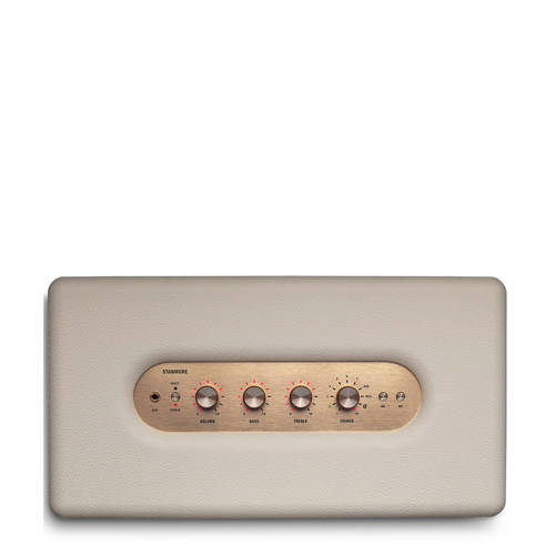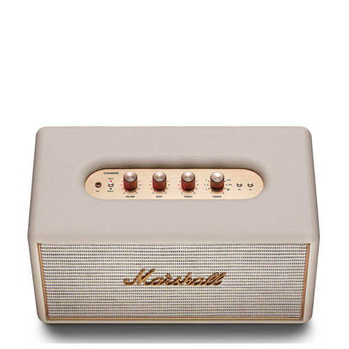 Marshall Multi-Room speaker Stanmore Wi-Fi (Creme)Het karakteristieke Marshall design met vinyldetails en het iconische scriptlogo zorgt ervoor dat deze speaker een aanvulling is op elke kamer/ruimte. Voorop de speaker is met trots het jaartal 1962 geplaats, dit is het oprichtingsjaartal van Marshall en verwijst naar de meer dan 50 jaar ervaring in het maken van kwaliteitsgeluidsapparatuur.Groter dan levensgroot geluidDe Stanmore biedt je een zuiver en nauwkeurig geluid, het is de meest veelzijdige speaker in de Marshall collectie en is daarom geschikt voor de akoestiek van iedere kamer.Draadloos verbindenBluetooth 5.0 en aptX-technologie biedt een verliesvrij draadloos geluid met een bereik van maximaal 10 meter, met behoud van de connectiviteit. Gebruik je smartphone, tablet of computer met Bluetooth om muziek rechtstreeks naar je speaker te streamen zonder kabels.Pas je geluid aanVerfijn jouw muziek met de Marshall Bluetooth-app of de analoge bedieningselementen op het bovenpaneel van de luidspreker om aan jouw eisen te voldoen.Bedrade connectiviteitDe Stanmore is uitgerust met een RCA- en 3,5 mm-ingang. Dit zorgt ervoor dat de mensen die genieten van een meer analoge geluidservaring ook alles uit de speaker kunnen halen.Multi-host functionaliteitDeze luidspreker is voorzien van multi-host functionaliteit, zodat je eenvoudig twee Bluetooth-apparaten kunt aansluiten en schakelen tussen de twee Bluetooth-apparaten. Zo kun je je favoriete muziek delen met je naasten en familie.Let op: Een accu ontbreekt. Dit apparaat moet dus op netstroom aangesloten worden