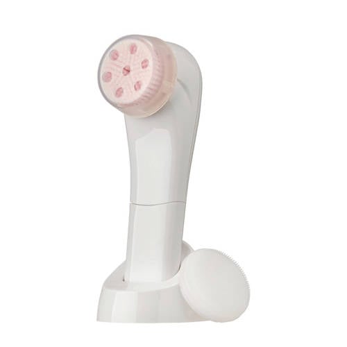Een gezichtsreinigingsysteem met twee borstelkoppen en een houder. Het werkt met rode fotonen van LED-licht, die erom bekend staan dat ze de huidcellen stimuleren. De microtrillingen helpen om je make-up snel te verwijderen, je huid zacht en diep te reiningen en dode huidcellen pijnloos te verwijderen. Het systeem is waterdicht, dus je kunt het ook onder de douche gebruiken. Het helpt om je huid er glad en stevig uit te laten zien en zichtbare verouderingsverschijnselen te vertragen. De zachte, reinigende roze borstelkop is voor het dagelijks reinigen van je huid. De siliconen borstelkop voor het zacht reinigen van de gevoelige huid. Het systeem werkt op twee AA-batterijen, deze worden niet meegeleverd. Lees eerst de gebruiksaanwijzing die in de verpakking zit.