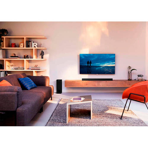 Deze Sony HTST5000 soundbar bestaat uit een draadloze subwoofer en een soundbar met 7.1.2 Dolby Atmos. Met de HTST5000 maak je van jouw huiskamer een ware discotheek of thuisbioscoop. Je kunt met de draadloze mogelijkheden ook verbinding met de ingebouwde Chromecast maken en op die manier gebruik van meer dan 100-audio apps rechtstreeks vanaf je tablet, smartphone of laptop. Met behulp van de Sony Music Center app kun je bepaalde Sony soundbars en draadloze speakers koppelen en groeperen, waardoor je in verschillende ruimtes naar dezelfde muziek kunt luisteren. Met deze set luister je muziek en kijk je naar films zoals de artiesten het bedoeld hebben. Hi-res verfijnd geluid met studiokwaliteit. Dolby Atmos zorgt ervoor dat je in 360 graden kunt genieten van adembenemend surround geluid, enkele omhoog gerichte speakers zorgen ervoor dat het geluid zelfs van boven komt voor de ultieme luisterervaring. Daarnaast beschikt het systeem over slimme technologieën zoals een digitale S-master HX-versterker die zorgt voor minder vervormingen meer precisie bij frequenties boven de 40 kHz. De Digital Sound Enhancement Engine HX zorgt voor opschaling door je muziek te analyseren en ontbrekende harmonieën toe te voegen, hiermee lijken zelfs mindere signalen bijna hoge resolutie te hebben.VerbindingsmogelijkhedenBedraad- 3 HDMI ingangen, 1 HDMi uitgang om eenvoudig het systeem met andere speakers uit te kunnen breiden en eenvoudig een TV of spelcomputer te verbinden- USB poort om bestanden van een externe harde schijf of USB stick af te spelenDraadloos- NFC voor snelle koppeling met andere NFC devices- Bluetooth met snelle LDAC gegevensoverdracht voor een hoogwaardige Bluetooth luisterervaring- Wi-Fi om direct en in hoge kwaliteit te streamen van je favoriete streamingdienstenSpecificaties:- Soundbar luidspreker- totaal vermogen: 90 Watt- Audio output channels: 7.1.2- Draadloze subwoofer- Aantal versterker kanalen7.1- Wi-FiJ- Bluetooth- Audio Return Channel (ARC)- Aantal HDMI poorten: 4- Aantal HDMI uitgang(en): 1- Aantal HDMI ingang(en): 3Afmetingen en gewicht- Afmetingen soundbar(hxbxd) 8x118x14,5 cm- Gewicht soundbar: 8,2 kg- Afmetingen subwoofer (hxbxd): 40,3x24,8x42,6 cm- Gewicht subwoofer: 14,1 kg