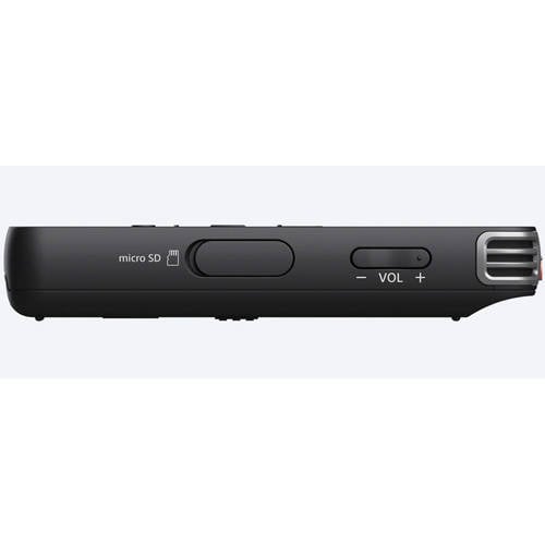 Neem iedere vergadering of interview zonder problemen op met de Sony ICD-UX570. Deze slimme voicerecorder past zich automatisch aan naar het type geluid en de omgeving. En je hebt goed overzicht dankzij het grote OLED-display - het is erg gemakkelijk om je opnamen te starten, af te luisteren of te beheren met meer helderheid op het grote display.Altijd de juiste opnameDoor Auto Voice Recording en Auto Music Recording weet de ICD-UX570 meteen wat voor audio je wilt opnemen en past zich daar op aan. Zo krijg je minder achtergrond geluid en zorgt het ervoor dat de microfoon geen dingen mist.Vind het juiste moment met Time Jump (Tijdssprong)Snel vooruitspoelen is ook eenvoudig. Je kunt eenvoudig de belangrijke delen van je vergadering, seminar or lezing vinden door met de functie Time Jump (Tijdssprong) steeds 10% van de totale afspeeltijd van de opname over te slaan.Vind moeiteloos wat je zoektMet de UX570-serie is het makkelijk om het afspeelpunt te bepalen dat je nodig hebt. Korte stukken overslaan is ook gemakkelijk dankzij de functie Easy Search (Makkelijk zoeken), waarmee je met een enkele druk op de knop 3 seconden terug of 10 seconden vooruit kunt springen.USB voor makkelijke bestandoverdrachtGeen USB kabel bij je om de audio bestanden over te hevelen? Je hebt hem met de ICD-UX570 niet eens nodig door de ingebouwde USB uitgang. Plug hem in je PC of laptop en je kan direct aan de slag.Uit te breiden geheugenEr zit al 4GB aan intern geheugen in deze recorder waarmee je tot 59 uur aan audio kan opnemen. Mocht dit toch nog niet genoeg zijn, kan je een microSDHC kaartje tot 32GB gebruiken, of een microSDXC van 64GB of zelfs meer.Ingebouwde microfoon: JaOndersteund audioformaat: AAC, LPCM, MP3, WMABeeldscherm: OLED DisplayIngebouwde luidsprekers: JaInterface: USBHoofdtelefoon uit: JaMicrofoon, line-in ingang: JaAfmeting hxbxd: 10,3x3x7x1,3 cmGewicht: 48 gram