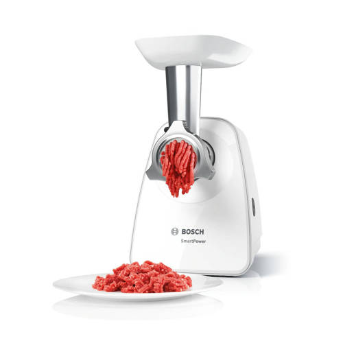 Met deze compact vormgegeven Bosch MFW2520W SmartPower vleesmolen kun je naast het bereiden van van vlees en vis, dankzij de meegeleverde accessoires ook kebbe en worst bereiden. De vleesmolen heeft een sterke motor met een vermogen van 350 Watt. Het apparaat is compact vormgegeven waardoor hij nooit in de weg staat en eenvoudig is op te bergen. De rubberen voetjes zorgen voor extra stabiliteit.De MFW2520W wordt geleverd met de volgende accessoires:- 1 x Vulhulpstuk- 1 x Vulschaal- 1 x Stopper- 1 x Worstendraaier- 1 x gaatjesschijven 8 mm- 1 x gaatjesschijven 3, 8 mm