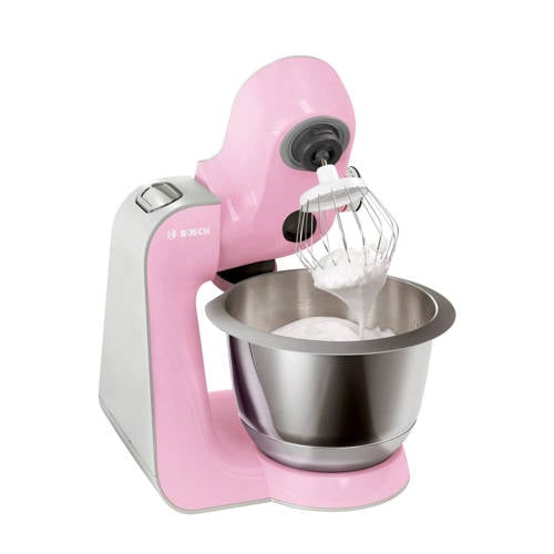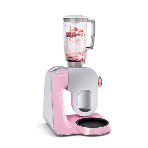 De Bosch MUM58K20 is een krachtige keukenmachine met een vermogen van 1000 Watt, 3D PlanetaryMixing en een EasyArmLift. De keukenmachine heeft 7 snelheden en een momentschakelaar en een elektronische toerenregeling voor een constante snelheid. De motor bouwt de snelheid geleidelijk op om spetteren te voorkomen. De rvs mengkom heeft een inhoud van 3.9 liter wat goed is voor maximaal 2.7 kg cakebeslag of 1.9 kg gistdeeg. De kunststof blenderbeker heeft een inhoud van 1.25 liter .De MUM58K20 is veelzijdig dankzij de brede range aan optionele accessiores.3D PlanetaryMixingSnel en perfect mengen van alle ingrediënten, dankzij het verbeterde planetaire mengsysteem met een uniek roterende beweging in drie dimensies tegelijk.EasyArmLiftGemakkelijk en moeiteloos verplaatsen van de 3-zone multifunctionele arm door een druk op de knop en eenvoudig vullen van de kom dankzij de automatische parkeerstand positie.Meegeleverde toebehoren1 x Deksel, 1 x Groentesnijder, 1 x Roestvrijstalen mengkom, 1 x Metalen kneedhaak, 1 x Kunststof mixerbeker, 1 x Tweezijdige raspschijf, 1 x Middelfijne raspschijf, 1 x Klopper, 1 x Tweezijdige snijschijf Specificaties- Vermogen: 1000 Watt- Kliksystem- 7 snelheidsstanden en een momentstand- Transparant anti-spatdeksel met vulschacht- Alle kunststof materialen welke in contact komen met voedsel zijn BPA vrij- Oververhittingsbeveiliging- Herinschakelingsbeveiliging- Met Interactieve recepten DVD en handige opbergtas zodat kan de patisserie set ruimtebesparend kan worden opgeborgen in de kom- Kleur: roze/zilver- Garantietermijn: 2 jaar