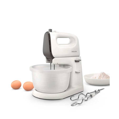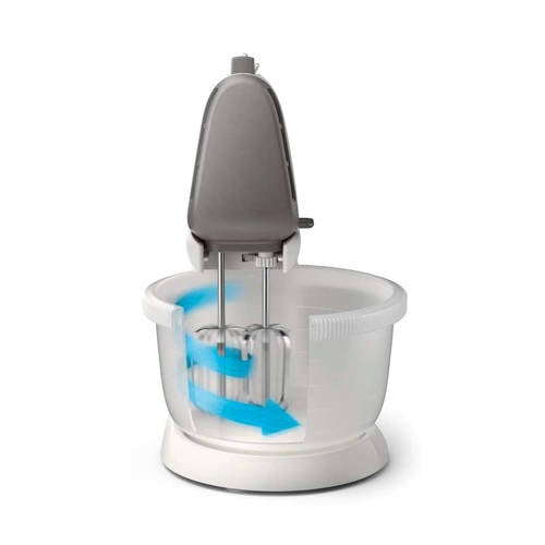 Krachtig en efficiënt mixen voor gladde cakes Philips HR3745/00 Viva Collection mixer met standaard en mengkom, heeft een krachtige motor met een vermogen van 450 Watt waarmee jij moeiteloos door het taaiste deeg komt. De kloppers zijn eenvoudig te monteren en met één druk op de knop te ontgrendelen. De zuignoppen aan de onderkant van de standaard houden de mixer en kom stabiel waardoor deze stevig verbonden is met de ondergrond.Kegelvormige klopperKegelvormige klopper voor maximale hoeveelheid luchtverwerking.5 snelheden en turbo functie5 snelheden en turbofunctie voor perfecte resultaten.Egaal mixenDe automatisch aangedreven kom draait automatisch zodat de ingredienten beter worden gemengd. De kom , met een inhoud van 3 liter, past naadloos bij de conische klopper voor een nog beter mixresultaat.AccessoiresKlopper met twee ballonnenKneedaccessoireSpecificaties- Opbergvak voor snoer- Aan/uit-schakelaar- Kominhoud: 3 liter- Snoerclip