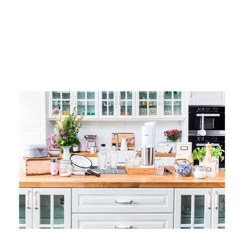 Met deze SodaStream soda maker Crystal kun je zelf bruisend water of een bruisende frisdrank maken van gewoon kraanwater. Het is vrij simpel en je kan het in een paar minuten fiksen. Vul een SodaStream fles met kraanwater tot aan de markering. Als je gekoeld water gebruikt krijgt je een beter resultaat. Vervolgens klik je de fles in het apparaat. Door 1 of meerdere keren op de knop te drukken voeg je bruis toe voor licht, medium of sterk bruisend water. Vervolgens sluit je de fles af met de dop. En je hebt een voor jou perfecte verfrissende bruisende fles water gemaakt. Gemakkelijk nietwaar. Ideaal voor bij de maaltijd of voor onderweg. Varieer eens door aan het water een smaakje toe te voegen zoals bijvoorbeeld – Citroen, Sinaasappel, Munt of Komkommer. Laat je fantasie de vrije loop er zijn mogelijkheden genoeg. Je ontvangt bij deze Sodastream maker Crystal - 2 glazen karaffen (75cl) en SodaStream 60 liter CO2 cilinder. De SodaStream maker is snoerloos en gebruikt geen elektriciteit.
