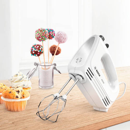 Deze Bosch MFQ24200 handmixer heeft een ergonomisch ontworpen behuizing en is geschikt voor links- en rechtshandige gebruikers. De mixer is voorzien van Bosch technologie en een moderne motor met een vermogen van 400 Watt die krachtig maar tegelijkertijd licht en stil is. Daarnaast beschikt de MFQ24200over 4 verschillende snelheden, een moment- en turbostand. Al het plastic dat met voedsel in contact komt is BPA vrij.Specificaties- Vermogen : 400 watt- Mixer afneembaar- Aantal standen: 4- Moment- en Turbostand- Aparte uitwerptoets voor gardes en kneedhaken- Accessoires: 2 x Turbo-klopper, 2 x kneedarm in roestvrij staal- Vaatwasserbestendige accessoires- Kleur: wit- Garantietermijn: 2 jaarAfmetingen en gewicht- Afmeting (hxbxd): 15,3x20x7,3 cm- Gewicht: 0,9 kg