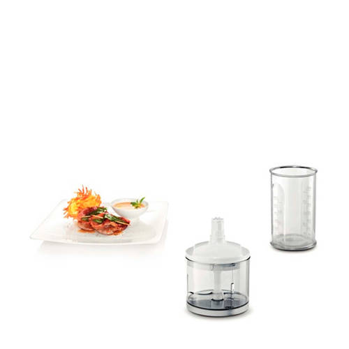 Snel en efficiënt mixen met één druk op de knopDe nieuwe staafmixer heeft een krachtige motor en een uniek ergonomisch design en mixt snel en efficiënt met slechts één druk op de knop. Zo bereidt je wanneer je wilt moeiteloos gezonde, zelfgemaakte maaltijden.Geavanceerde ProMix-mengtechnologiePhilips ProMix is ontwikkeld in samenwerking met de prestigieuze universiteit van Stuttgart, en is een unieke en geavanceerde technologie met een specifieke driehoekige vorm voor optimale toevoer van etenswaren en maximale prestaties voor sneller en constanter mixen.Antispat mesbeschermerDe speciale golvende vorm van het onderste deel van de staafmixer voorkomt spatten en knoeien tijdens het mixen.Snel ontkoppelingssysteem met één knopAvoor diverse functies kunnen met één knop eenvoudig worden bevestigd of verwijderd.GardeDe garde van de Philips-staafmixer is ideaal voor het maken van slagroom, mayonnaise, pannenkoekenbeslag en nog veel meer.Turbofunctie voor extra vermogenMet de turbofunctie van de Philips-staafmixer hak je heel eenvoudig zelfs de hardste ingrediënten klein met één druk op de knopCompacte fijnsnijderMet het compacte fijnsnijderaccessoire kun je eenvoudig kruiden, noten, kaas, chocolade en uien hakken.