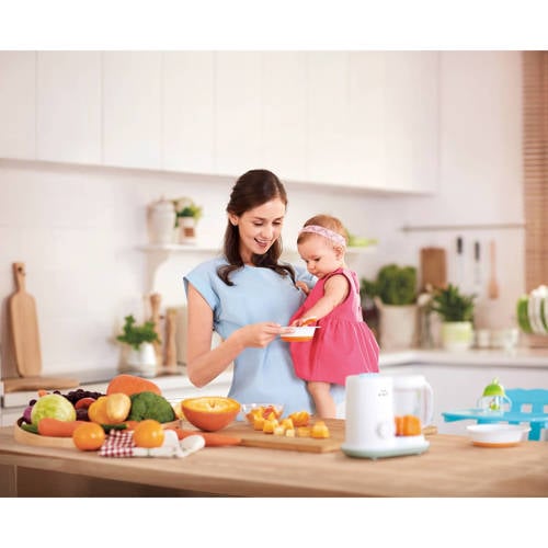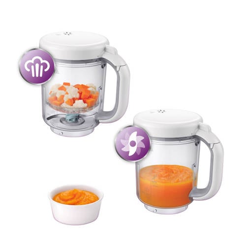 Eenvoudig gezonde maaltijden klaarmaken voor jouw kindjeDeze babyvoedingmaker blender / stomer van Philips AVENT maakt het mogelijk. Of je nou fijn geblend fruit en groente wil klaarmaken of vlees wil serveren, het kan allemaal. Ook kan deze voedingmaker de ingrediënten voor je stomen. Stomen is de gezonde manier van koken. Het apparaat is voorzien van een grote watertank, dit maakt het mogelijk om hygiënisch te koken met stom. De kom, deksel en het blad zijn vaatwasserbestendig. Voorzien van veiligheidsvergrendeling van de deksel voor veilig gebruik.Unieke stoomtechnologie Stomen is een gezonde manier van koken. Onze technologie met circulerende stoom zorgt ervoor dat de stoom van beneden naar boven circuleert, waardoor alle ingrediënten gelijkmatig worden gegaard zonder te koken. De voedzame kracht, textuur en het kookvocht blijven behouden tijdens het mengen. Eenvoudige stappen voor babymaaltijden Deze babyvoedingmaker combineert stomen en mengen, waardoor je eenvoudig babymaaltijden bereidt. Begin de ingrediënten te stomen, meng ze vervolgens eenvoudig totdat de gewenste consistentie is bereikt en serveer de maaltijd. Voeding voor elke fase Van zeer fijn gemengde groenten en fruit tot combinaties van ingrediënten zoals vlees, vis en peulvruchten en het creëren van vastere structuren: deze babyvoedingmaker maakt het bereiden van gezond voedsel eenvoudig voor elke vastevoedingsfase. Eenvoudig mengen Dit slimme dekseldesign houdt alle ingrediënten in de kan, waardoor er geen voeding in het waterreservoir komt. Mengen is eenvoudig, met minder stappen van stomen tot mengen. Gemakkelijk schoon te maken De extra grote opening van het waterreservoir van de babyvoedingmaker is eenvoudig te reinigen en vullen. Zo kun je met schone stoom koken, elke keer weer. Vaatwasmachinebestendig (kan, deksel en mes).