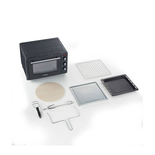 Severin TO2058 grill-bakoven met hete luchtfunctie en praktisch draaispit voor vlees en gevogelte.De TO2058 heeft een 4-standenschakelaar(bovenhitte, onderhitte, bovenhitte en draaispit, boven- en onderhitte met hetelucht)en een120 minuten timer met signaal na bereiden van de ingestelde baktijd.De thermostaat is regelbaar van 60° - 230° Celsius. De bijgeleverde pizzasteen met een doorsneden van 29 cm is ook geschikt voor grote pizza's.Specificaties:- Uitvoering: hittebestendig gelakte behuizing- Aansluitwaarde: 1800 Watt- Vermogen oven: 1800 Watt- Vermogen grill:4 x 450 Watt- Aantal bakplaten: 1- Aantal roosters: 1- Boven- en onderwarmte- Hetelucht functie- Max temperatuur: 230 graden- Min temperatuur: 60 graden- Draaispit- Grillfunctie- Inhoud ovenruimte: 42 liter- Materiaal ovenruimte: RVS - Snel voorverwarmen- Temperatuurregeling- Tijdsinstelling- Type bediening: draaiknoppen- Kleur: zwart-zilver- Garantietermijn: 2 jaarAfmetingen en gewicht:- Afmeting (hxbxd): 36.5x52x42 cm- Binnenmaat (hxbxd): 24x38x33 cm- Gewicht: 8.272 kg