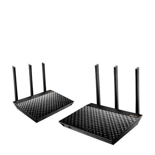 Asus RT-AC67U 2 pack router met AC1900 dual-band mesh wifi-systeem voor de hele woning, voor grote huizen en woningen met meerdere verdiepingen. Ondersteunt flexibele SSID-instelling, bekabelde interrouter verbindingen, AiProtection Pro-netwerkbeveiliging aangedreven door Trend Micro en Adaptive QoS.Datasnelheid802.11a : 6,9,12,18,24,36,48,54 Mbps802.11b : 1, 2, 5.5, 11 Mbps802.11g : 6,9,12,18,24,36,48,54 Mbps802.11n : up to 450 Mbps802.11n TurboQAM : up to 600 Mbps802.11ac : up to 1300 MbpsCompatible besturingssystemen- Windows 7, Windows® 10, Windows® 8.1 (for Wi-Fi card), Windows® 8, Windows XP Mac OS X or higher(for Wi-Fi card), Linux- Reken af met dode wifizones - Dual-band, AC1900 mesh wifi-systeem levert krachtige wifi tot in elke hoek van het huis.- Flexibele netwerknaam - Creëer één SSID voor het hele netwerk of afzonderlijke SSID's voor elke frequentieband.- Rijke functionaliteit - Complete routerfunctionaliteit met diensten zoals VPN, adaptieve QoS en meer.- Bekabelde interrouter verbindingen - Creëer een optionele bekabelde verbinding tussen routers voor snellere, stabielere wifi.- Complete netwerkbeveiliging voor het gezin - Het AiMesh AC1900 wifi-systeem beschermt alle aangesloten apparaten tegen cyberdreigingen, en geavanceerd ouderlijk toezicht filtert op ongepaste content voor je gezin.
