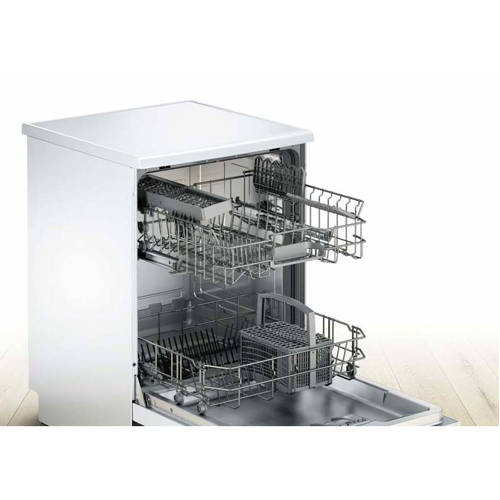 Deze Bosch SMS46AI05E stille, vrijstaande vaatwasser is RVS, met energieklasse A+, is geschikt voor 12 couverts. Je hebt de keuze uit 4 verschillende temperaturen en 6 wasprogramma’s: Intensief 70°C, Auto 45-65°C, Eco 50°C, Stil 50°C, Glas 40°C, Voorspoelen. De Extra Droog functie maakt moeilijk te drogen vaat toch goed droog. De vaatwasser heeft een bestekkorf en de bovenkorf kun je in de hoogte verstellen. De doseerassistent zorgt voor een gelijkmatige verspreiding van het afwasmiddelen met de VarioSpeedfunctie kun je tijd en energie beperken. Met de MachineCare functie reinig je je vaatwasser en de bijbehorende filters. Als je dit regelmatig doet dan verleng je de levensduur van je vaatwasser. Specificaties:- AquaSensor functie- AquaStop functie- Digitaal display- Bediening: knoppen- Materiaal kuip: kunststof- Uitgestelde start tot 24 uur- Resttijdindicatie- Snoerlengte: 1.75 meter- Lengte watertoevoerslang: 1.4 meter- Lengte afvoerslang: 1.9 meter