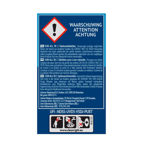 Met Pure Clean Technology voor een uitstekend resultaatSun Expert All-in 1 vaatwastabletten, met Pro Clean Technologie. Met de Pro Clean Technologie ben je verzekerd van actieve kalkverwijdering, een frisse en hygiënisch schone machine en de geur van natuurlijke munt-extracten. Door de ingebouwde spoelglans en zoutfunctie, zorgen deze vaatwastabletten niet alleen voor het reinigen van je vaat maar ook voor extra glans en voorkomen ze kalkaanslag. Zout en spoelglans hoeven dus niet afzonderlijk toegevoegd te worden, voor nog meer gebruiksgemak. De vaatwastabletten zijn verpakt in hydrofilm folie. Dit is 100% oplosbaar in water, je kunt de folie dus gewoon om het tablet laten zitten. Sun all-in 1 bevat geen fosfaat.Kenmerken:- Met Pure Clean Technology- Actie kalkverwijdering- Frisse en hygiënisch schone machine- Natuurlijke munt-extracten- Met oplosbaar tabletfolieDeze voordeelverpakking bevat 6 pakken met 24 tabs, samen goed voor 144 vaatwasbeurten.Wist je dat afwassen met de machine minder water verbruikt dan afwassen met de hand? Moderne vaatwassers verbruiken slechts 10 à 15l water per afwas. Bij afspoelen en afwassen met de hand wordt al gauw meer water gebruikt. Vergeet niet dat uit een stromende kraan al snel 10l water per minuut komt. Nog enkele tips om uw energie- en watergebruik te beperken: 1) Laat de vaatwasser enkel draaien wanneer hij vol is, 2) Kies voor een A-merk vaatwasser, 3) Kies voor Sun producten. Deze zijn fosfaatvrij en dus wordt er rekening gehouden met het milieu. Bovendien zijn de verpakkingen van de tabletten 100% recyclebaar, 4) Voorspoelen is niet nodig, 5) Gebruik de programma’s op lage temperaturen, 55°C volstaat. Sun wordt aanbevolen door grote merken, zoals Tefal, Curver en Bormioli Rocco.