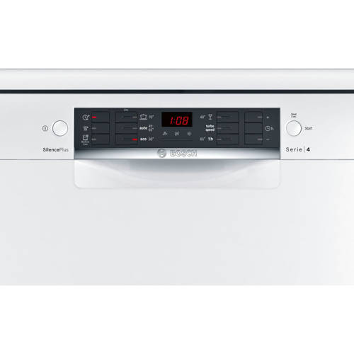 De Bosch SMS25AI04E vaatwasser is met 46dB lekker stil. En dankzij VarioSpeedPlus spoelt hij ook nog eens drie keer sneller met een optimaal reinigings- en droogresultaat. De spoeltijd verkort je met één druk op de knop tot wel 66%. Handig wanneer je snel schoon servies nodig hebt op bijvoorbeeld een verjaardag. De vaatwasser bschikt over vijf verschillende programma's zoals Intensief 70 en Eco 50. Ook zitten er twee speciale functies op waaronder Extra Droog. Een handige optie om vaat die moeilijk te drogen is toch beter droog te krijgen. In de vaatwasser is plek voor 12 standaard couverts. De Bosch SMS25AI04E vaatwasser beschermt je glazen, flessen en vazen extra goed het glasbeschermingssysteem. Hiermee regelt de vaatwasser de hardheid van het water, zodat zelfs je fijnste glazen met de grootst mogelijke zorg worden behandeld. Verder beschikt de vaatwasser over energieklasse A+, kinderbeveiliging, in hoogte verstelbare bovenkorf en een doseerassistent welke het vaatwasmiddel gelijkmatig verspreid. Vaatwassen met minder energie en meer resultaatDe Bosch SMS25AI04E is zeer milieuvriendelijk. Hij levert namelijk uitzonderlijke reinigingsprestaties met minder water en energie. Door verschillende technieken wordt water en energie bespaard voor een betere watercirculatie. En de AquaSensor past het waterverbruik aan op basis van het type en de hoeveelheid vuil. Afhankelijk van de hoeveelheid vuil en resten van vet of afwasmiddel bepaalt de AquaSensor of het nodig is om het spoelproces voort te zetten.