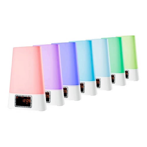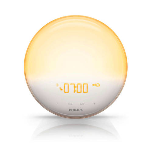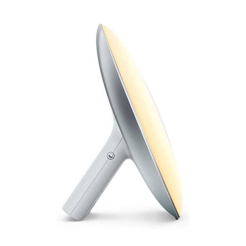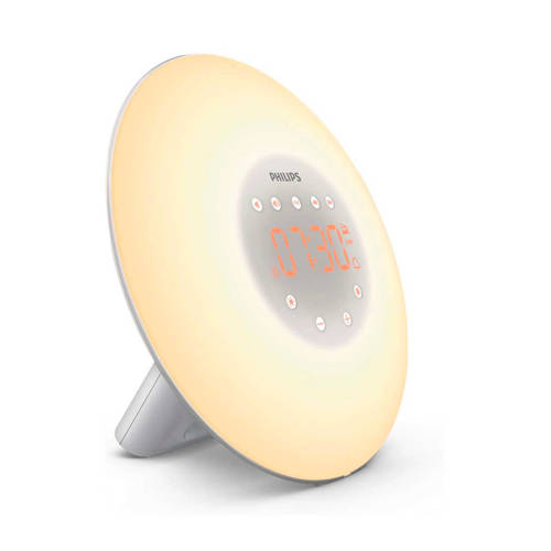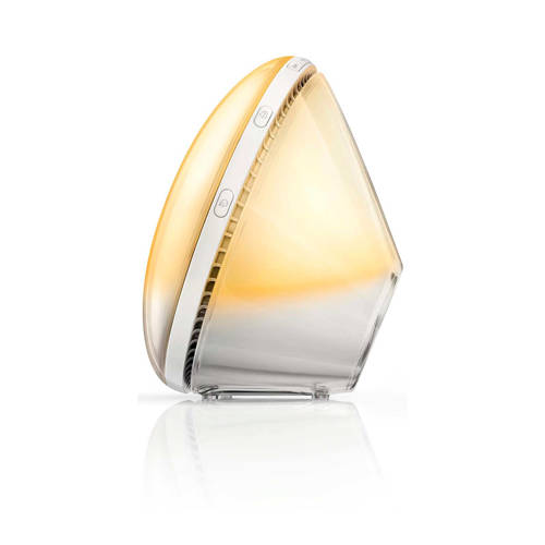 Ga ontspannen slapen en word uitgerust wakker.De Sleep & Wake-up Light is ontworpen om u te helpen ontspannen en uitgerust wakker te laten worden. Met lampjes die uw ademhaling begeleiden en persoonlijke zoninstellingen. Van de slaapexperts en makers van de toonaangevende Wake-up Light.Natuurlijke zonsopgang simuleren Het licht wordt vóór uw wektijd geleidelijk sterker, net als bij zonsopkomst. Binnen 30 minuten verandert het van zacht ochtendrood in oranje om uw kamer uiteindelijk met helder geel licht te vullen. Het proces van veranderend en feller wordend licht stimuleert uw lichaam om op een natuurlijke manier wakker te worden, omdat het licht uw lichaam langzaam voorbereidt op het ontwaken terwijl u nog slaapt. Terwijl het licht feller wordt, zorgt het door u gekozen natuurlijke geluid of de geselecteerde radiozender er bovendien voor dat u helemaal wakker wordt en klaar bent voor de dag. Met RelaxBreathe om in slaap te vallenOnze lichtgestuurde ontspanningsfunctie is geïnspireerd op bekende ademhalings- en ontspanningsoefeningen en is ontworpen om u te helpen in slaap te vallen. U laat de spanning van de dag van u af glijden en komt tot rust. Volg met uw ademhaling een van de zeven lichtintensiteits- of geluidsritmes, terwijl u uw ogen gesloten houdt voor een rustige en vreedzame overgang van dag naar dromen.Simulatie van zonsondergang om in slaap te vallen Het programma voor simulatie van zonsondergang bereidt uw lichaam voor op het slapen door het licht en optionele geluid geleidelijk te dimmen gedurende de tijd die u hebt ingesteld, en helpt u te ontspannen voordat u gaat slapen. Meerdere opties voor geluid en muziek Word wakker met geluiden uit de natuur, sfeervolle muziek of uw favoriete FMradiozender. Op de ingestelde wektijd begint het geselecteerde geluid zacht te spelen, waarna het binnen een paar minuten langzaam harder wordt tot het vooraf ingestelde niveau. De overgang van slaap naar ontwaken is geleidelijk, maar bedoeld om u uiteindelijk volledig wakker te maken. Sluit uw mobiele apparaat of tablet op de AUX-poort aan om de lamp als luidspreker te laten functioneren. Meerdere helderheidsinstellingen De gevoeligheid voor licht verschilt per persoon. Een helderheidsniveau waarvan u meteen wakker wordt, heeft misschien geen enkele invloed op iemand anders. Dankzij meerdere lichtinstellingen kunt u het intensiteitsniveau kiezen dat precies goed is voor u. In het algemeen geldt: bij een hogere lichtintensiteit kost het minder tijd om volledig te ontwaken. Op momenten dat u niet in slaap hoeft te vallen of te ontwaken, functioneert de Wake-up Light als instelbare bed- of leeslamp. Nacht- en leeslamp De ideale lichtintensiteit zorgt dat u comfortabel kunt lezen voordat u gaat slapen. Wanneer u RelaxBreathe of simulatie van de zonsondergang gebruikt, zorgt de automatische uitschakeling dat het licht na een ingestelde periode uitgaat. Terwijl u slaapt, wordt de verlichte klok volledig gedimd om uw kamer donkerder te maken. Wanneer u de klok midden in de nacht inschakelt, geeft deze net genoeg licht om in het donker de weg te vinden, zodat u in en uit bed kunt stappen zonder dat uw zintuigen door fel licht worden geprikkeld. Geef eenvoudig persoonlijke instellingen voor de lichtintensiteit en alarmplanner op. Raak aan om te sluimeren Met een lichte tik bovenop de Wake-up Light schakelt u de sluimerstand in. Na negen minuten begint het geluid opnieuw zachtjes te klinken.