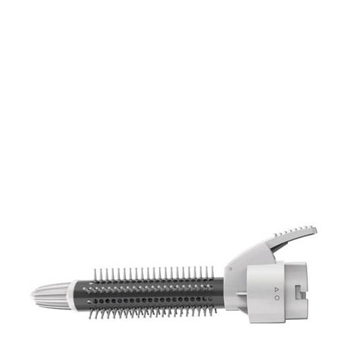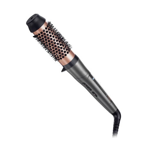 De innovatieve thermische borstel van 38 mm doorsnee verzorgt elk haartype optimaal en levert perfect volume. De keramische coating van de borstel is verrijkt met keratine en amandelolie die over je haar verdeeld worden tijdens het stylen. De hoogwaardige gemengde borstelharen zorgen keer op keer voor dansende krullen en veerkrachtige slag met gladde haarpunten en een zijdezachte uitstraling.Dit apparaat, trendy uitgevoerd in zachtgrijs en roségoud, heeft een digitaal temperatuurdisplay waarmee je 5 standen tot 180 ºC kunt selecteren. Bovendien warmt de krultang op in slechts 30 seconden, waardoor je je styling helemaal zelf kunt bepalen: stem de temperatuur af op jouw persoonlijke haartype voor soepele slag of een volumineuze krullenbos. Met de Keratin Protect Heated Barrel Brush creëer je nonchalante slag door grote plukken in één keer een energieboost te geven. Draai de borstel tijdens het stylen onderaan naar buiten of naar binnen om je haarpunten op te laten krullen. Je gezicht krijgt een meer open uitstraling door je lokken naar buiten te borstelen. Fixeer de krullen met je handen en droge textuurspray om volume en speelsheid te creëren.
