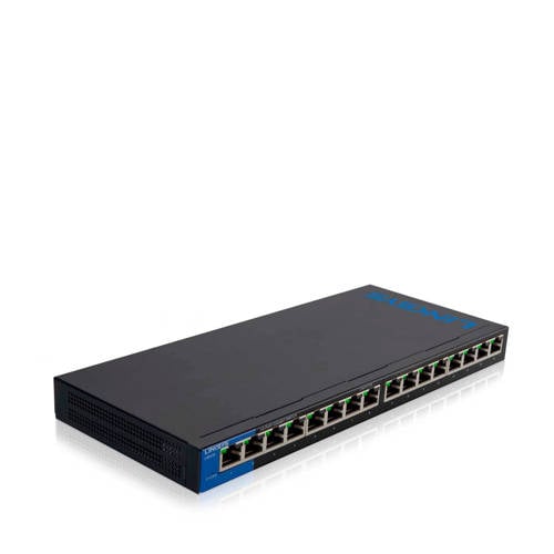 Linksys 16-poorts Gigabit – desktopswitchUw prestaties en productiviteit schieten omhoog wanneer u grote bestanden met Gigabit-snelheden verstuurt naar servers, schijven en printers in uw netwerk.Gigabit – PrestatiesKortere overdrachtstijden en een betere streaming van bestanden die veel bandbreedte gebruiken naar verbonden apparaten, zonder storing.Plug-&-Play gemakVergroot uw kantoornetwerk via een snelle en eenvoudige installatie.Quality of service (QOS) voor verkeersprioriteringGeef voorrang aan bepaalde apparaten of activiteiten zodat de doorvoer van bedrijfskritische gegevens niet nadelig beïnvloedt wordt door drukte op het netwerk.Poorten met automatische detectieAutomatische optimalisatie van de snelheid voor elk aangesloten apparaat.Energiebesparende functiesInnovatieve functies die ervoor zorgen dat ongebruikte poorten automatisch worden uitgeschakeld en stroomverbruik bij korte kabels wordt verminderd en een poortstatusschakelaar waarmee de LED-lampjes in- en uitgeschakeld kunnen worden.Kenmerken:- Bedrade verbindingssnelheid tot 1.000 Mbps- 16 Gigabit Ethernet-poorten met automatische detectie- Quality of Service (QoS) voor verkeersprioritering- Energiebesparende functies- Eenvoudige Plug-and-Play-verbinding