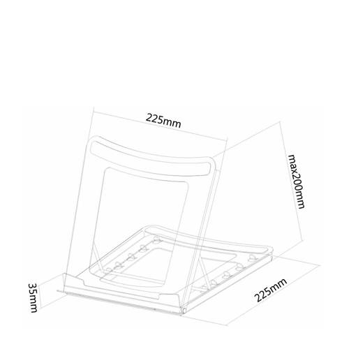 De NSLS075BLACK is een universele notebook standaard waarmee je jouw notebook in een ergonomische positie plaatst.Vijf standenGemakkelijk verstelbaar in 5 standen. Ideaal voor de juiste kijkhouding ten opzichte van de notebook. Door zijn design is hij eenvoudig in te klappen, lichtgewicht en mobiel.Uniek luchtdoorlatend designHet unieke design, gemaakt van staal met poedercoat afwerking en siliconen anti-slip pads, laat warme lucht eenvoudig wegstromen waardoor oververhitting van de notebook wordt voorkomen. Hierdoor blijft uw notebook snel en betrouwbaar.Afmetingen: zie afbeelding