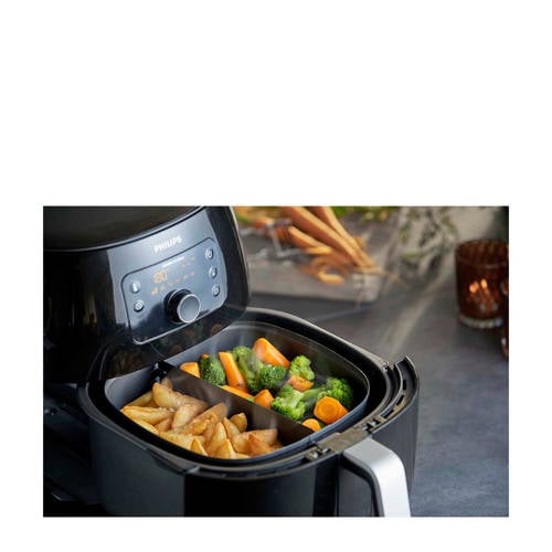 Snacken zonder te veel vet binnen te krijgen? Met de Philips Essential Airfryer XL HD9262/90 in huis wordt dit mogelijk. Bereid met weinig tot geen olie heerlijke gerechten voor maximaal 5 personen. Door de Rapid Air technologie worden de etenswaren knapperig van buiten en blijven ze mals van binnen. Ook krijg je een snackdeksel meegeleverd, dit deksel voor snacks is ideaal voor gerechten met een langere bereidingstijd, zoals cheesecake en brood - het vertraagt de bruining op de bovenkant, terwijl de binnenkant heerlijk wordt afgebakkenLekkere snacks zoals chips, tortilla's en gedroogd fruitMet het deksel voor snacks gebruikt je, je Airfryer nog vaker. Maak je eigen gezonde snacks, friet, tortilla's en gedroogd fruit, en bak perfecte cakes en brood.Rapid Air-technologieMet de airfryer kun je gerechten frituren, bakken, braden en grillen zonder het gebruik van extra vet of met aanzienlijk minder vet dan bij normale frituurpannen. Het is de alles-in-één oplossing voor je keuken. Een ander voordeel van de airfryer is dat er een minimale geur ontstaat bij het bereiden van gerechten. Ook is de airfryer gemakkelijk schoon te maken is.Internationaal receptenboekjeDit receptenboek bevat recepten voor allerlei gefrituurde gerechten die weinig vet bevatten en die je in de Airfryer kunt bereiden. Daarnaast wordt de veelzijdigheid van het apparaat getoond, want met de Airfryer kun je immers ook gezonder, sneller en gemakkelijker grillen, bakken en zelfs roosteren.Digitaal aanraakschermMet het digitale aanraakscherm voorop de airfryer kun je gemakkelijk de temperatuur en de bereidingstijd instellen voor optimale resultaten.Gemakkelijk schoon te makenDe verwijderbare lade met antiaanbaklaag en de mand zijn vaatwasmachinebestendig voor snel en gemakkelijk schoonmaken.Vaatwasmachinebestendig voor alle uitneembare onderdelenDe QuickClean-mand van de Philips Airfryer is gemaakt met een rooster met antiaanbaklaag voor eenvoudig schoonmaken. Alle verwijderbare onderdelen kunnen in de vaatwasmachine worden schoongemaakt. Frituren met lucht betekent ook dat je huis vrij blijft van de geur van traditioneel frituren.Uniek productontwerpDe Philips Airfryer combineert een zeestervormig ontwerp aan de onderkant met snelle circulatie van superhete lucht, wat resulteert in een optimale verdeling van de warmte. Deze unieke combinatie zorgt ervoor dat de Airfryer verschillende soorten eten bereidt met een heerlijk knapperig resultaat en door weinig of geen olie toe te voegen.Slimme instelknopBewaar de instellingen voor jouw favoriete gerecht, zodat jouw maaltijd de volgende keer klaar is met een druk op de knop!