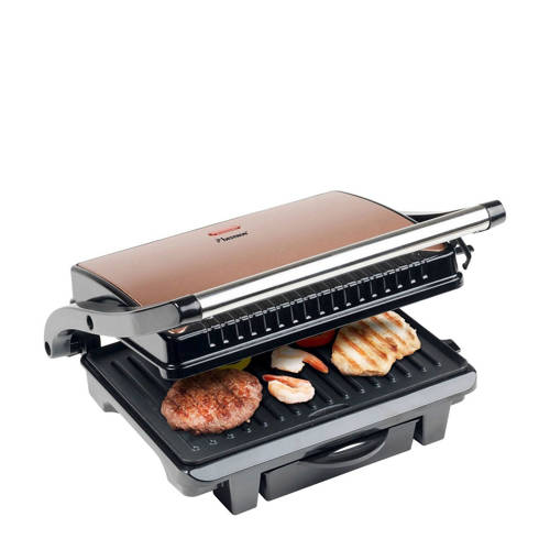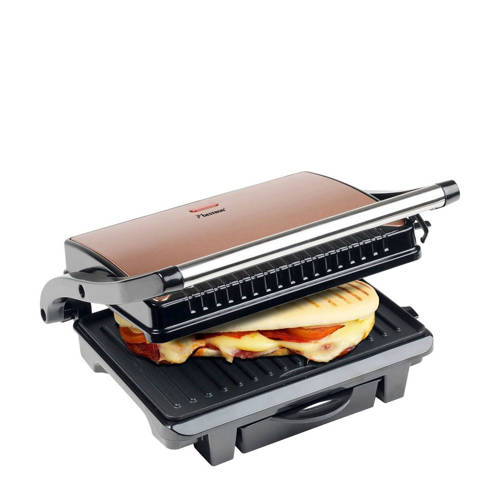 Deze Bestron ASW113CO contactgrill heeft een vermogen van 1000 Watt en een grilloppervlak met antiaanbaklaag van ca. 28 x 17 cm. Met deze contactgrill, met een stijlvol koperdesign, kun je vetarm contactgrillen en gelijkmatig bakken aan beide zijden. Veelzijdig en snel inzetbaar voor het grillen en toasten van: Panini’s, steaks, toast, groente, gamba’s, vlees en vis.Met: - Opvangbakje voor vet en vleessappen- Hittebestendige behuizing met grote hittebestendige handgreep- Dekselvergrendeling voor ruimtebesparende verticale opberging- Praktisch snoeropwikkelsysteem- Inclusief diverse recepten- Met GS-gecertificeerd keurmerk = extra hoge kwaliteit en veiligheidsstandaard