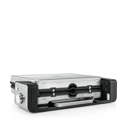 DeWMF Lono 2-in-1 contactgrillwerkt als een gesloten contactgrill en een grote scharnierbare tafelgrill. De Vario-Flex grillplaat is uniek en past zich optimaal aan aan voedsel op verschillende hoogtes. De 2 niet-klevende grillplaten kunnen bijna al het voedsel grillen; een sappige steak, een zachte witvis, gegrilde aubergines. De WMF Lono contactgrill is erg flexibel zodat het al het voedsel, hoe groot of hoe klein, kan grillen.De temperatuurinstelling is handmatig in te stellen en dankzij de antikleefcoating heb je geen olie of vet nodig, wel zo gezond!
