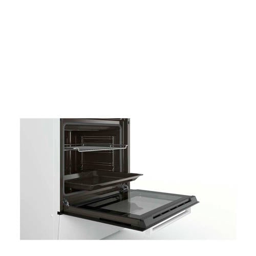 Koken met dit Bosch HXA090D20N gasfornuis is nu een koud kunstje. En de oven kent in totaal 7 functies te weten: 3D hetelucht Plus, Boven- en onderwarmte, Onderwarmte, Infracirculatiegrill, Pizzastand en snel voorverwarmen. De meest unieke is de 3D hetelucht Plus. De 3D hetelucht plus functie verspreidt de hitte gelijkmatig door de oven door de nauwkeurig geplaatste luchtstroomopeningen, de functie maakt het mogelijk gelijktijdig te bakken op maximaal 3 niveaus. Met energieklasse A, 4 kookzones en een oveninhoud van 66 liter. De HXA090D20N heeft onder andere een elektrische vonkontsteking, geëmailleerde pannendragers en glazen afdekplaat. Verder met halogeen ovenverlichting, een kinderbeveiliging en een thermo-elektrische beveiliging. Dus geen vlam, geen gas. Thermo-elektrische beveiligingGasbranders met thermo-elektrische beveiliging zijn voorzien van een thermokoppel. Mocht de gasvlam onbedoeld uitgaan, dan sluit het thermokoppel na maximaal 90 seconden de toevoer van gas af. Kort gezegd: geen vlam, geen gas. Bij een gaskookplaat met thermo-elektrische beveiliging kan de brander dus nooit een grote hoeveelheid gas in je keuken laten ontstaan.Specificaties- Energieklasse: A - Kookzone 1 linksvoor: 3000 watt (wokbrander) - Kookzone 2 linksachter: 1750 watt (normaalbrander) - Kookzone 3 rechtsachter: 1000 watt (sudderbrander) - Kookzone 4 rechtsvoor: 1750 watt (normaalbrander) - Temperatuurregeling van 50 °C - 275 °C - Type pandragers: geëmailleerde pannendragers - Elektrische vonkontsteking - Energiesoort oven (elektrisch/gas): elektrisch- Kinderbeveiliging - Opberglade - Aantal bakplaten: 1 - Aantal roosters: 1 - Kleur: wit Afmetingen en gewicht - (Hxbxd): 85x60x60 cm - (Hxbxd) oven: 32,9x48,2x42 cm - Gewicht: 52,5 kg- Elektriciteitssnoer: 120 cm