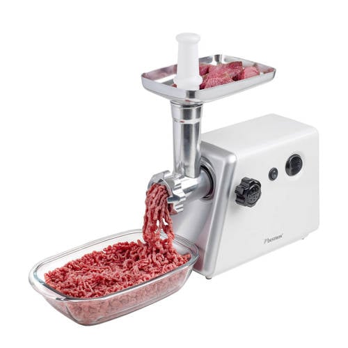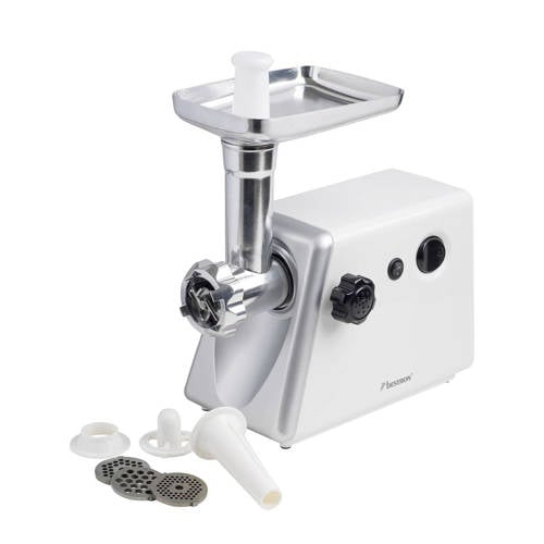 Deze Bestron AMG600 elektrische vleesmolen heeft een vermogen van 450 Watt en aan/uitschakelaar met terugloopfunctie. De AMG600 is voorzien van een hygiënisch rvs vulplateau, een hoogwaardig rvs mes en maalspiraal. Naast het malen van vlees kun je met deze vleesmolen ook worst maken. De vleesmolen is eenvoudig te reinigen en wordt geleverd met 2 jaar garantie.Specificaties-Vermogen: 450 Watt- Aantal snelheden: 1- Antislip voetjes- Materiaal machine: metaal en kunststof- Geluidsniveau: 77 dB- Snoerlengte: 92 cm- 3 maalschijven: grof (7mm), medium (5mm) en fijn (3mm)- Inclusief kunststof aandrukker, opzetstukken voor worst en Kibbeh (Oriëntaals vleesgerecht)- Kleur: wit/rvs- Garantietermijn: 2 jaarAfmetingen en gewicht- Afmetingen (hxbxd) 34x33,5x15 cm- Gewicht: 3,42 kg